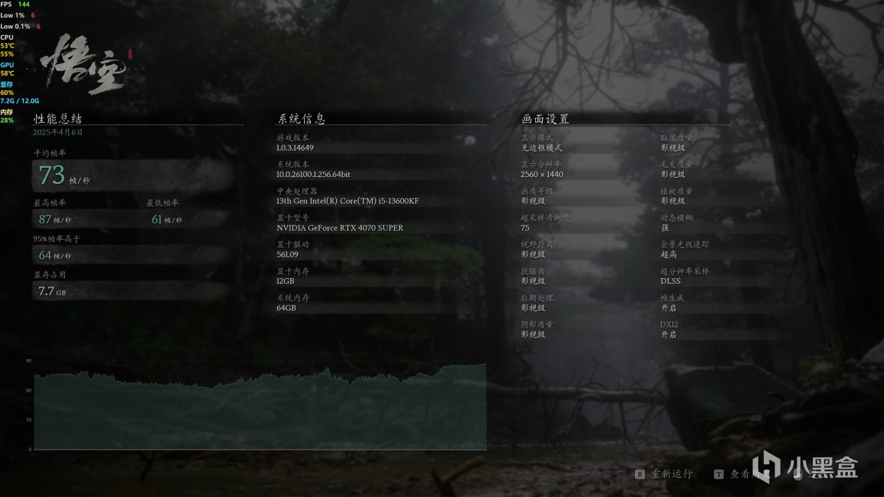 在黑神话测试中,默频和XMP超频后的测试结果一样。2K影视级画质,超高光追、开启帧生成、75超采样清晰度,平均帧数为73FPS。