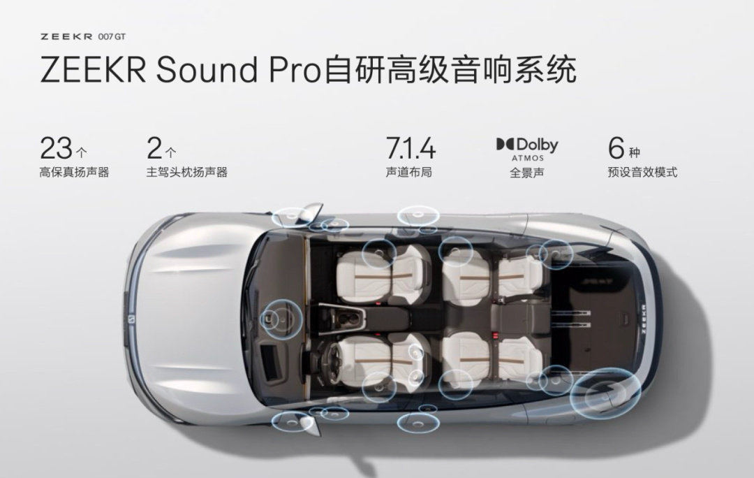 这次在GT上,音响升级到了ZEEKR Sound Pro,扬声器从21个加到23个,峰值功率从1900W变成2160W。我的听感是,人声分离做得更好,混响很有临场感,听起来真的享受。