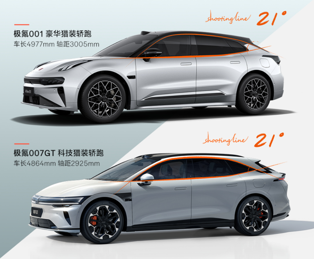 极氪这个屁股有个设计叫Shooting Line 21°猎装线,就是D柱和窗线的夹角是21°,在极氪001上也是这样。