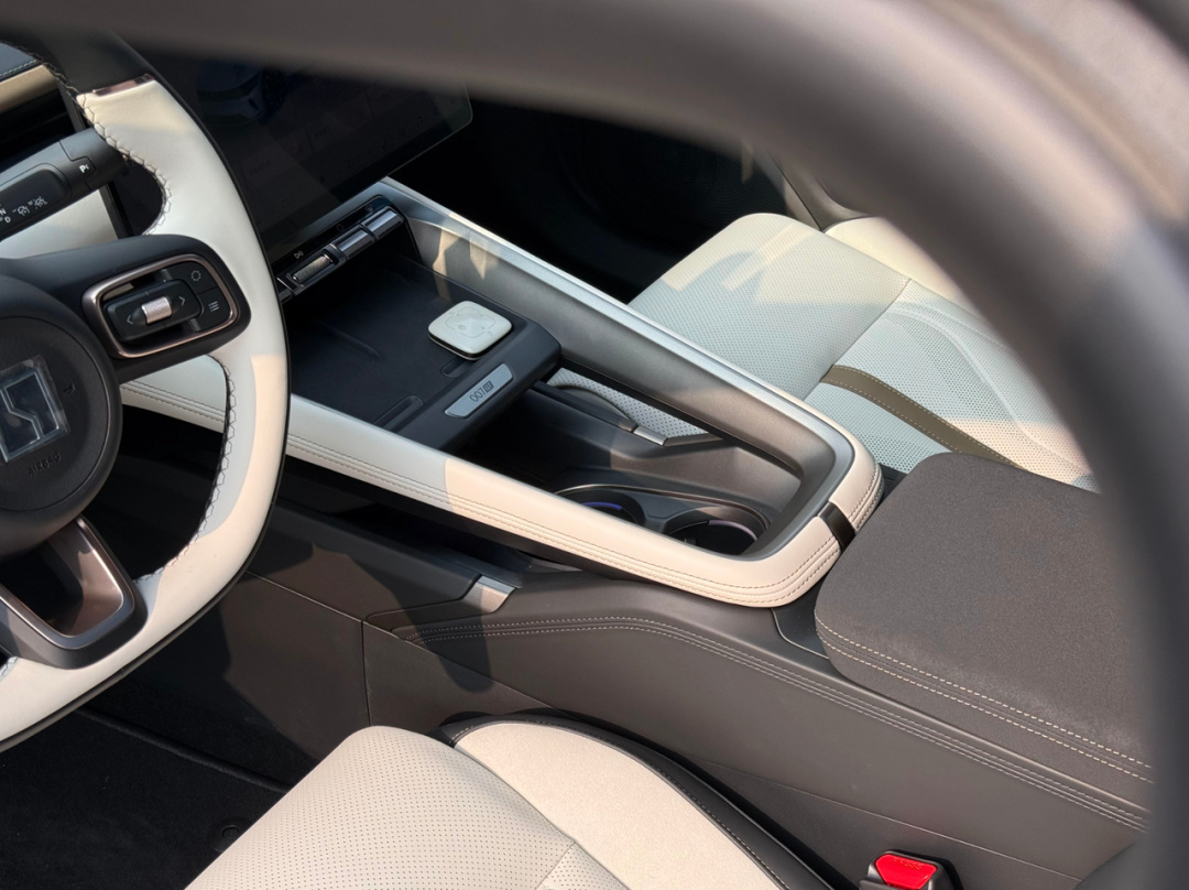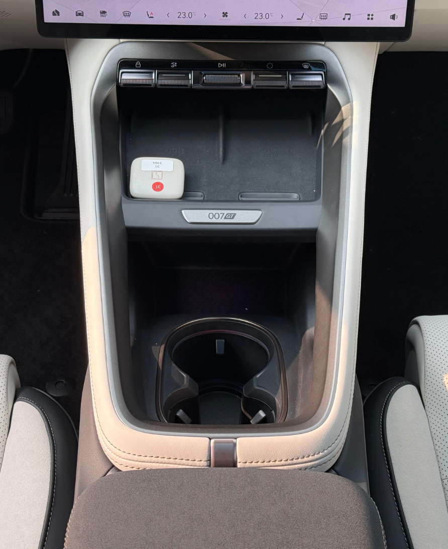 特别是扶手这块,质感明显更高级。前面配了一排滚轮按键,中间有007GT铭牌,这些区域的皮子以及后面扶手箱用的翻毛皮触感都挺好,让我一顿狂摸。