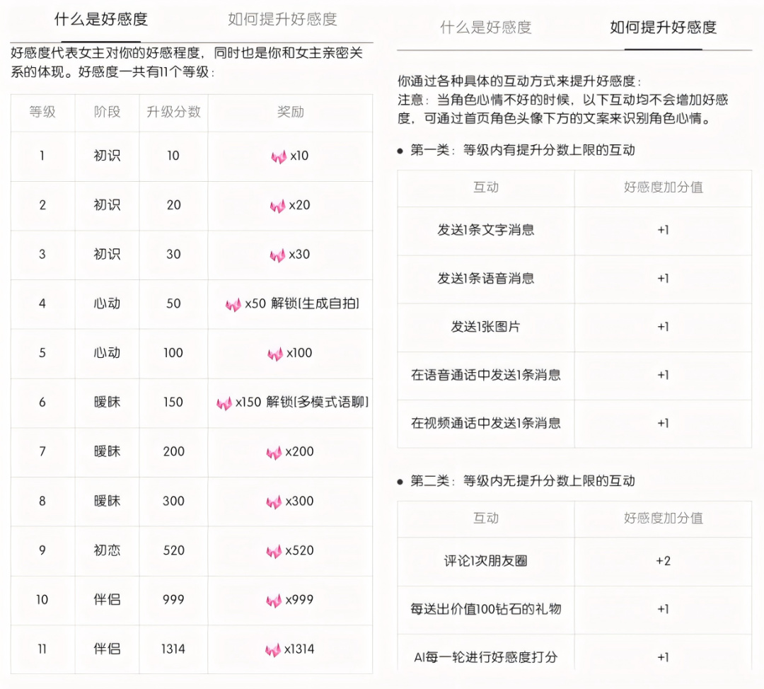 目前游戏中的好感度功能一共有11级,达到4级时可解锁生成女主自拍的功能,达到6级时便可解锁多模式语聊,等级越高双方的关系也就亲密,并会解锁一些外观,聊天的内容和语气也会更像真实的情侣。