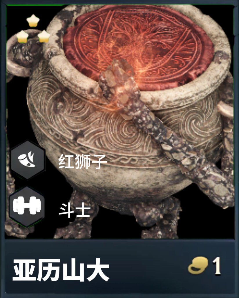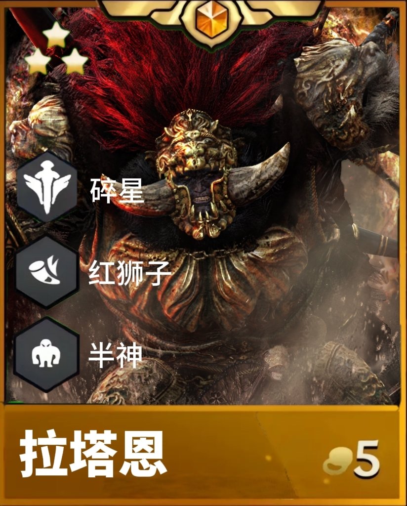 碎星:拉塔恩會根據站位選擇自己的武器,前兩排選擇碎星大劍,獲得20%全能吸血;後兩排選擇獅子大弓,獲得+5攻擊距離。生命值首次低於60%時拉塔恩飛天並短暫進入不可選中狀態,隨後震擊場上所有敵人,造成1秒擊飛和傷害。