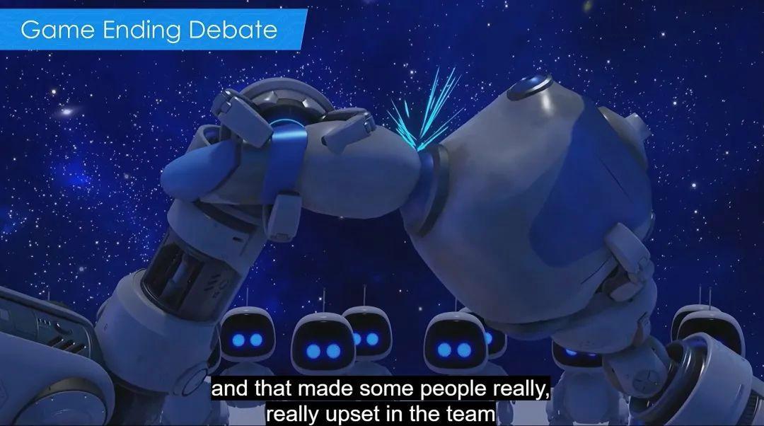在《宇宙机器人》结局中,玩家需要用收集的肢体零件与其他机器人的帮助来重组破损的阿斯特罗。杜塞透露,原始设计中玩家拿到的是完全肢解的阿斯特罗——没有头部和四肢,仅剩躯干。但这个设计让部分测试者"非常不安",因此团队改用了现行版本中相对完整的残躯。