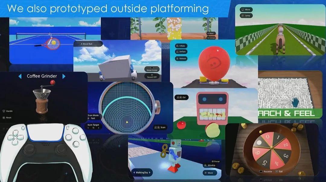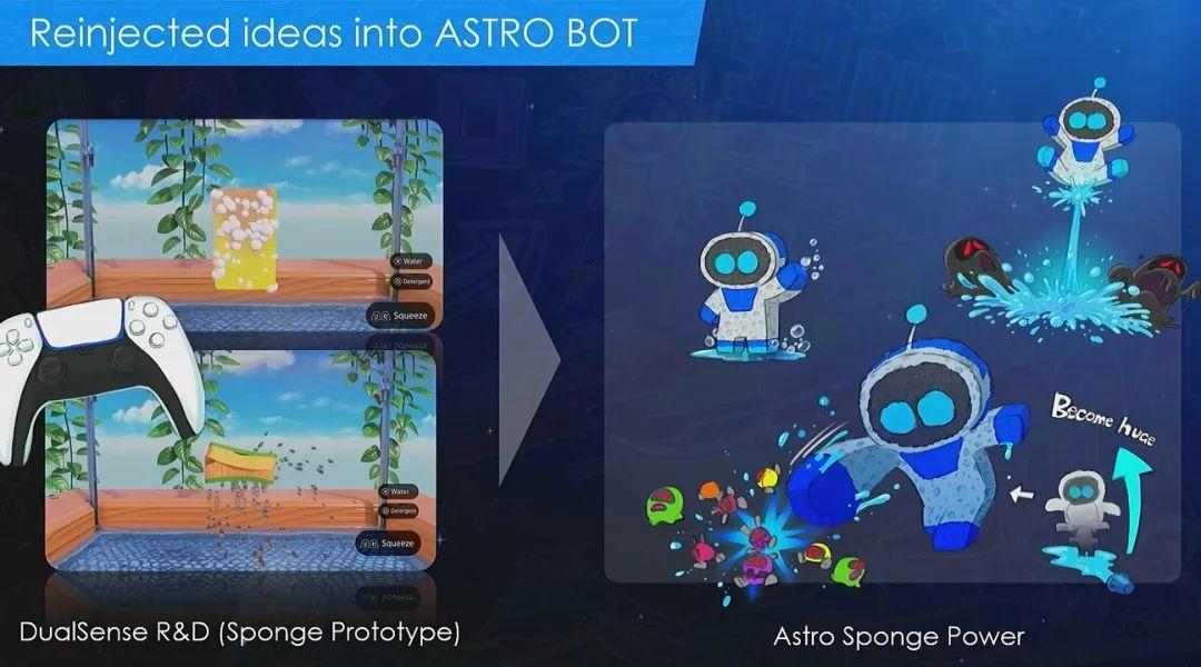 杜塞指出,原型测试对《宇宙机器人》团队如此重要,以至于专门保留了几名程序员负责制作与平台跳跃完全无关的原型。这正是游戏"海绵能力"的起源——他们制作了一个通过自适应扳机挤干海绵的原型,发现其趣味性后将其纳入了正式游戏。