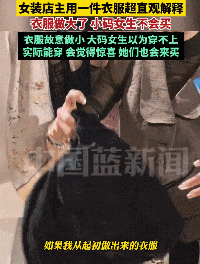 随着消费者对女装尺码乱象的不满加剧,近日,浙江杭州某女装店主针对女装为什么越做越小这个问题进行了直观解释:衣服做大了,小码女生不会买;衣服故意做小,大码女生以为穿不上但实际能穿,会觉得惊喜,她们也会来买。