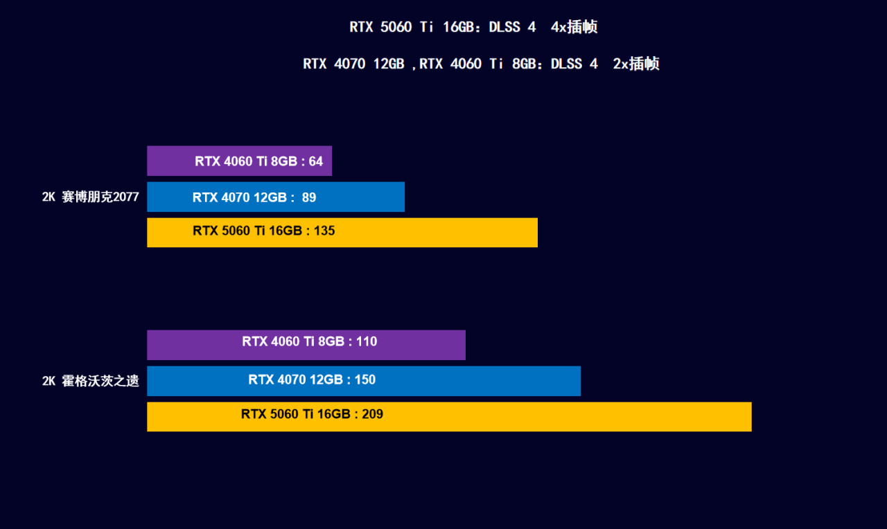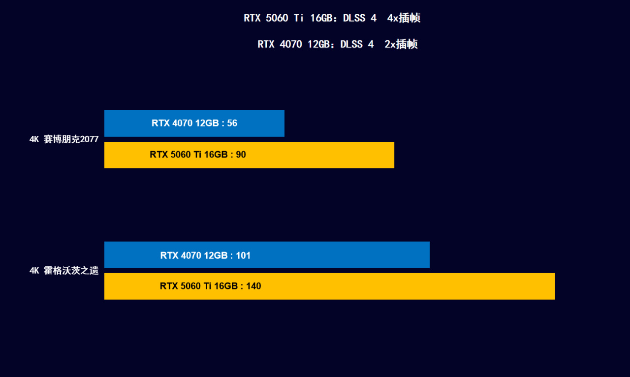 4K 賽博朋克2077 ,RTX 5060Ti 16GB 領先RTX 4070 60%, 霍格沃茨之遺 領先RTX 4070 38%