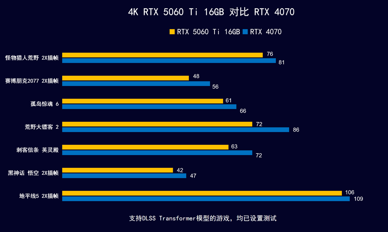 其餘遊戲,RTX 4070 領先RTX 5060 Ti 16GB大約7%-13%左右