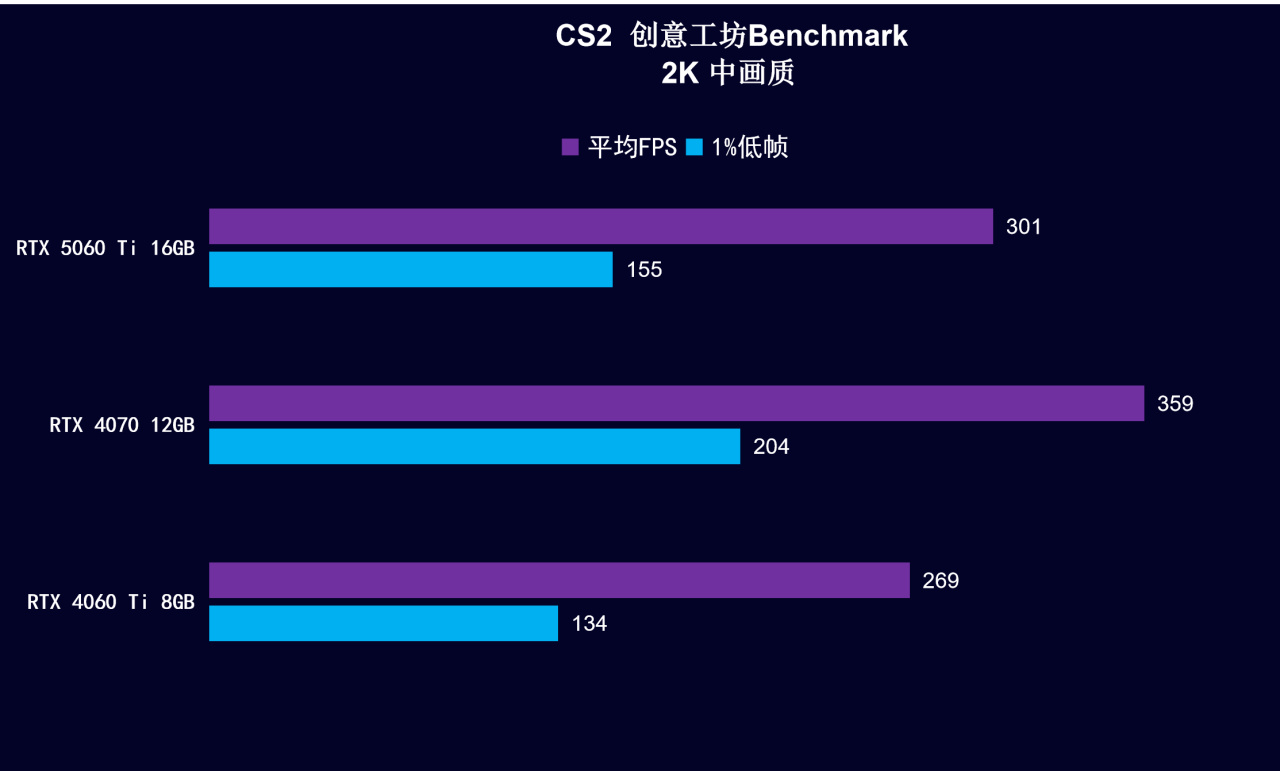 RTX 5060 Ti 16GB遊戲平均FPS 領先RTX 4060 Ti 8GB 11% , 比RTX 4070弱19%,