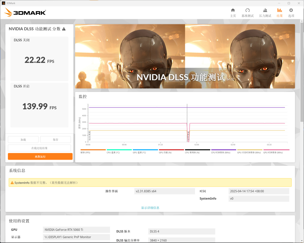 開啓DLSS Performance模式實測139.99FPS,關閉DLSS時僅有22.22FPS