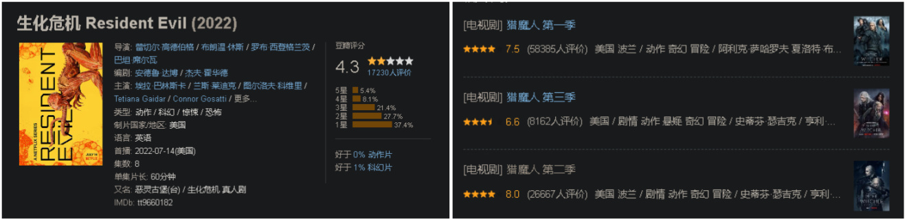 生化危机真人剧崩盘,巫师剧集把亨利恶心走之后,咖喱法为首的选角问题就立马成为新目标,爱刷剧的朋友应该也知道卡维尔是非常喜欢打游戏的,能接巫师剧集薪资肯定没那么高,很大原因肯定是因为他对巫师系列的热爱,这热爱能顶着咖喱法也能让观众看的还不错,被宫走之后,剧集评分直接崩盘。