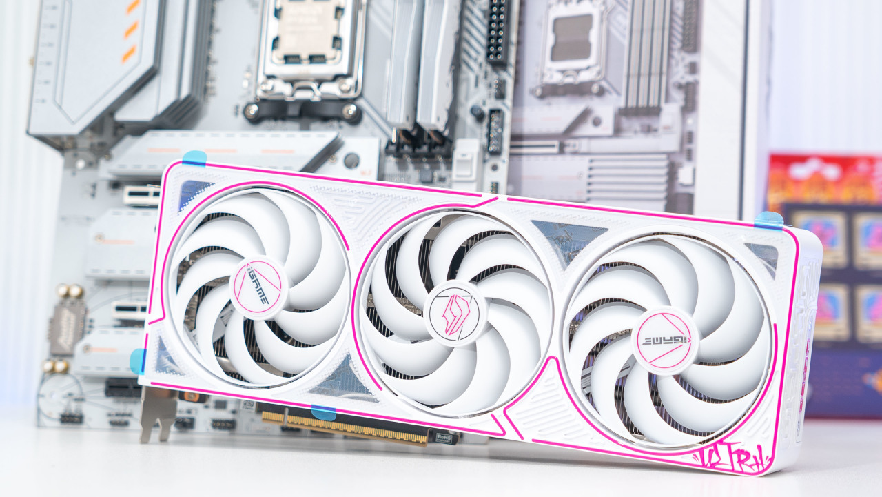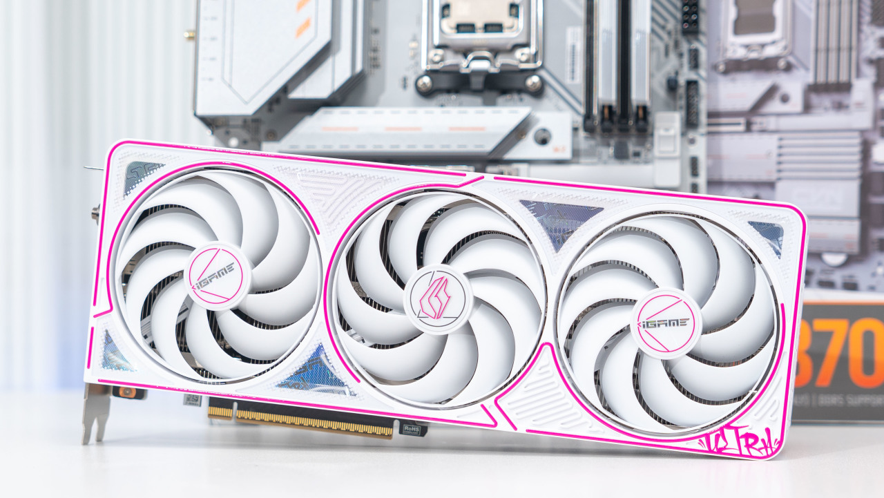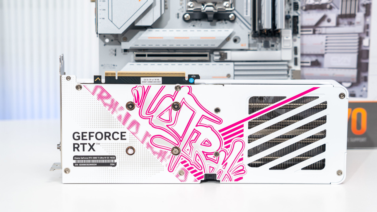 七彩虹這張iGame GeForce RTX 5060 Ti Ultra W OC 顯卡的外觀整體做了更多潮流元素點綴,融入了很多嘻哈的元素。整體設計風格也與之前的波普藝術相呼應,具有系列延續性。顯卡整體以白色爲主,更多桃粉色點綴。我相信這張卡也會吸引更多喜歡芭比粉的猛男玩家選擇。