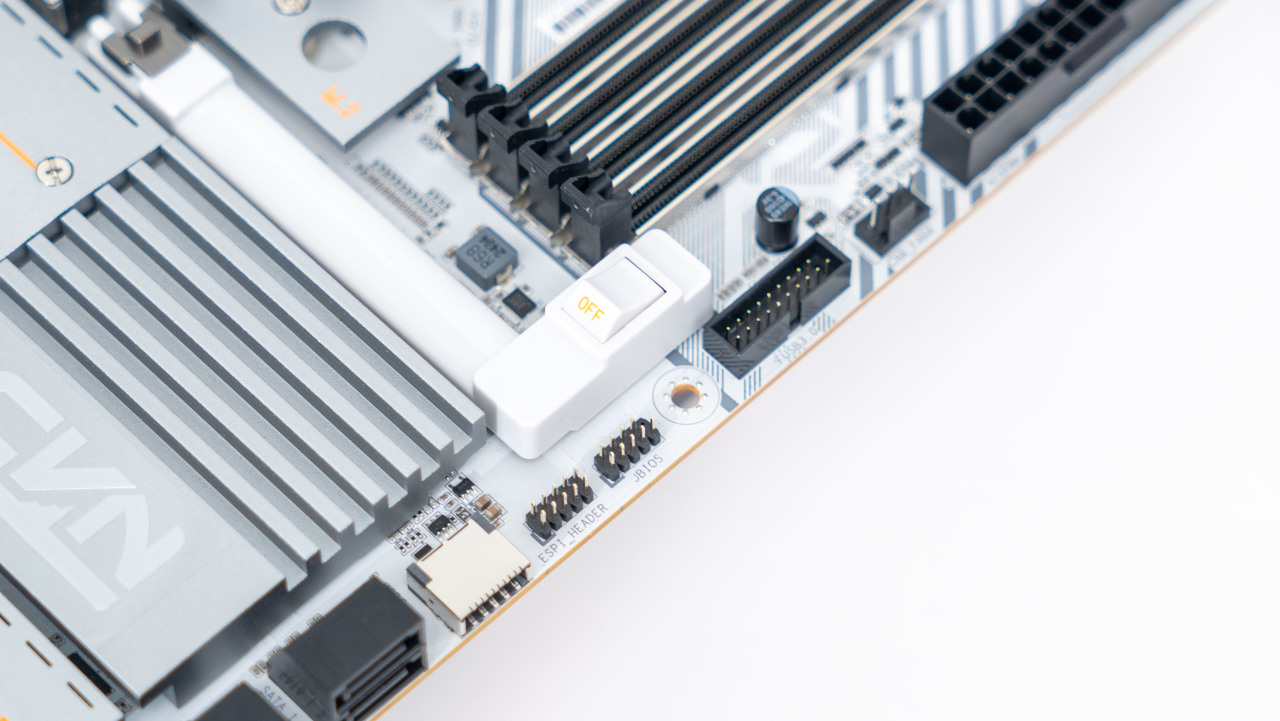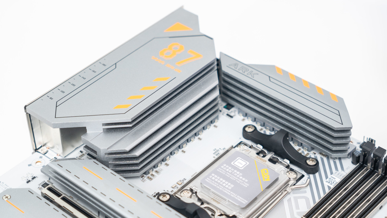 主板正面白色的PCB搭配鈦灰色的寒霜散熱裝甲顏值非常好看,醒目的「舷號」87作爲裝飾點綴,堆疊式設計的寒霜散熱裝甲配合導熱貼可以大幅提升散熱效果。
