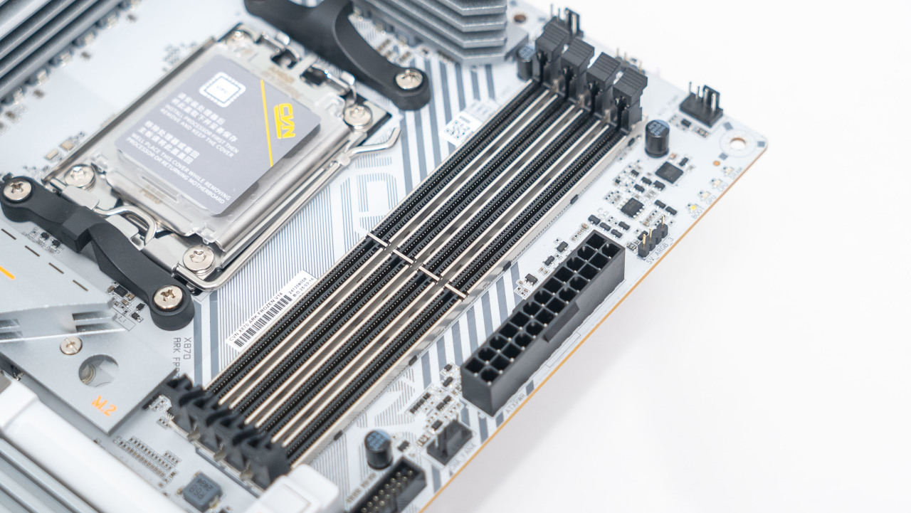 內存插槽方面這次也做了優化,最大支持192GB(48GB x4)的DDR5內存插槽,合金加強的DDR5內存插槽+加厚鍍金觸點設計。支持AMD EXPO 技術,擁有8200MHz OC+內存超頻潛力。內存一側還有Debug燈指示燈,可以幫助玩家快速檢測硬件運行情況。