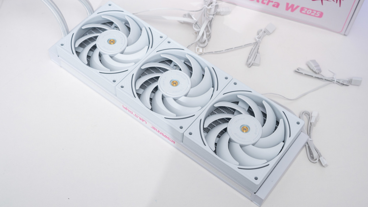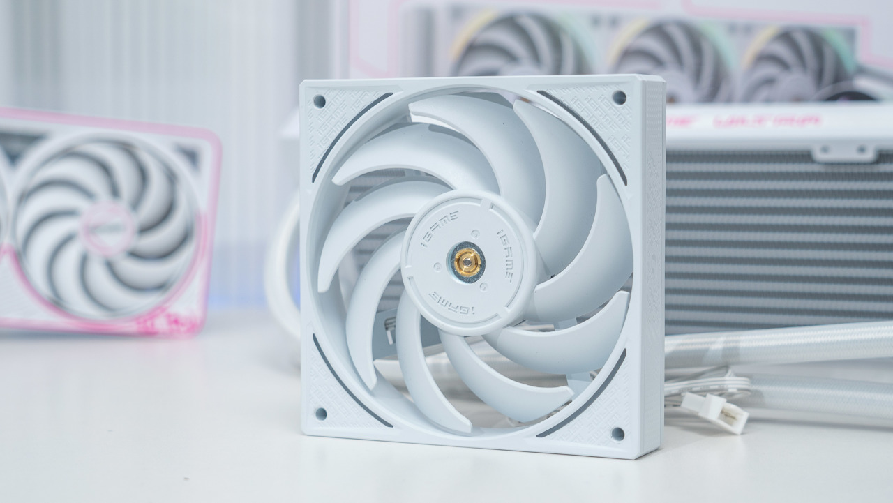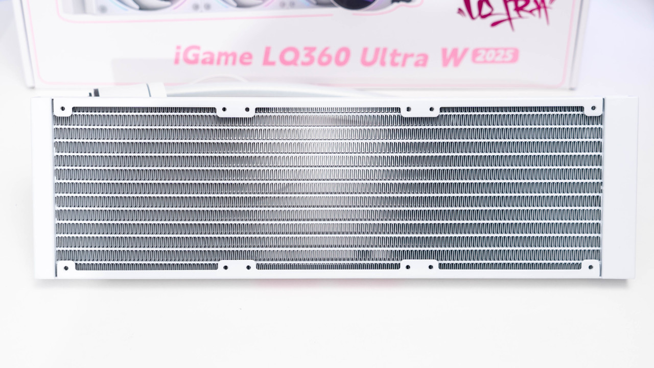 白色的水冷主體搭配的是iGame F12025 ARGB Ultra LITE風扇,整體白色散熱主體搭配粉色的iGame Ultra字體點綴。