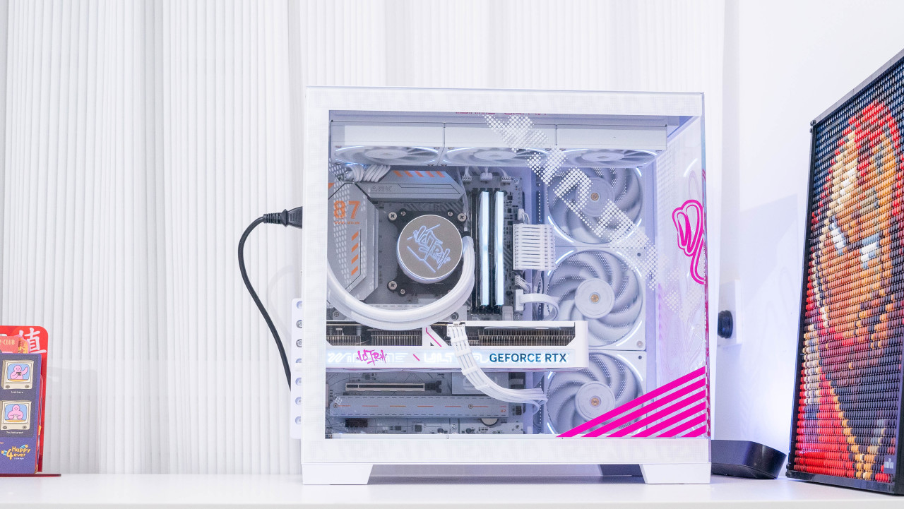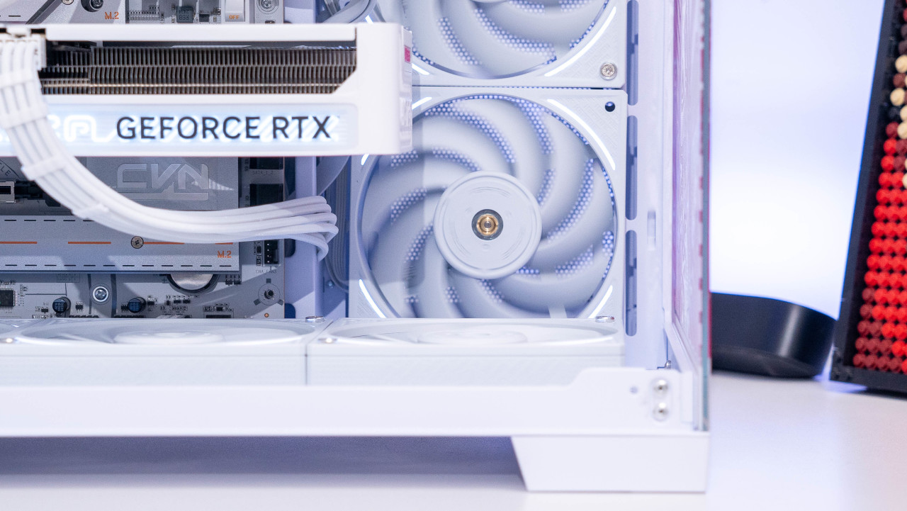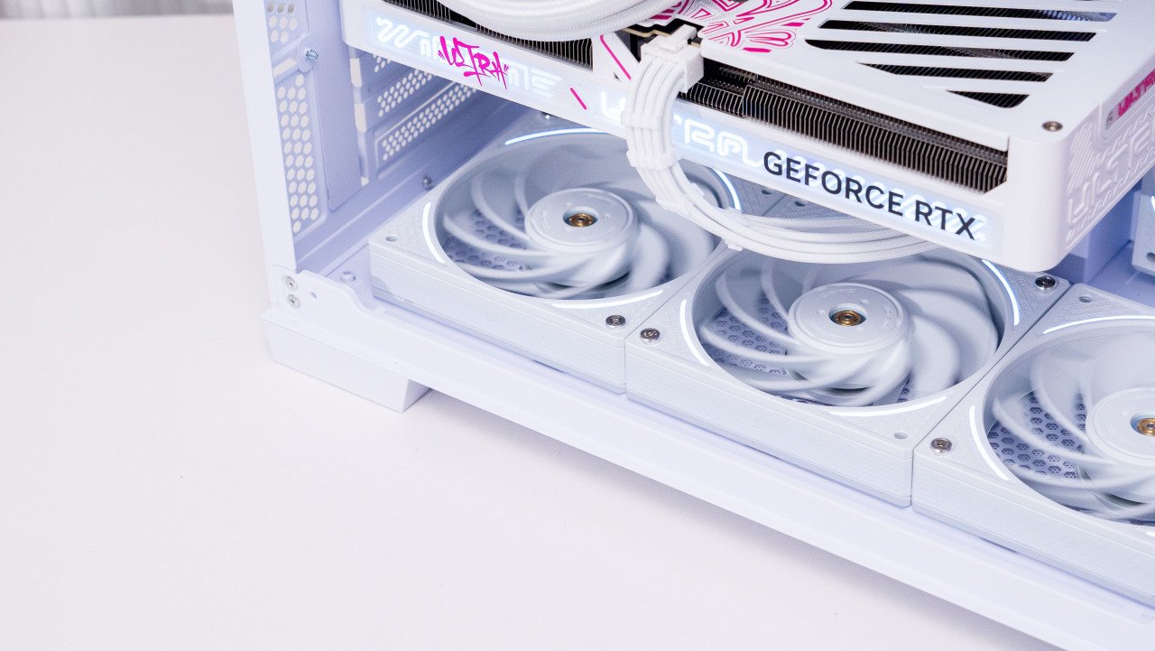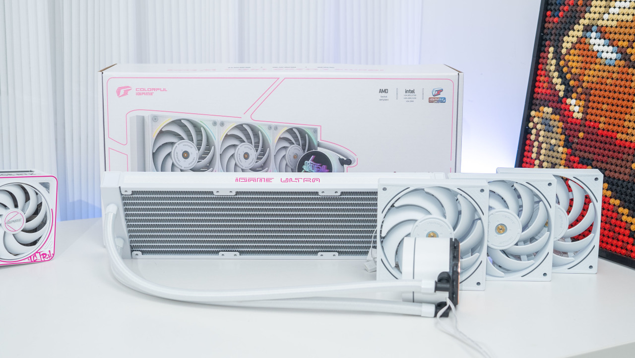 白色的水冷主體搭配的是iGame F12025 ARGB Ultra LITE風扇,整體白色散熱主體搭配粉色的iGame Ultra字體點綴。