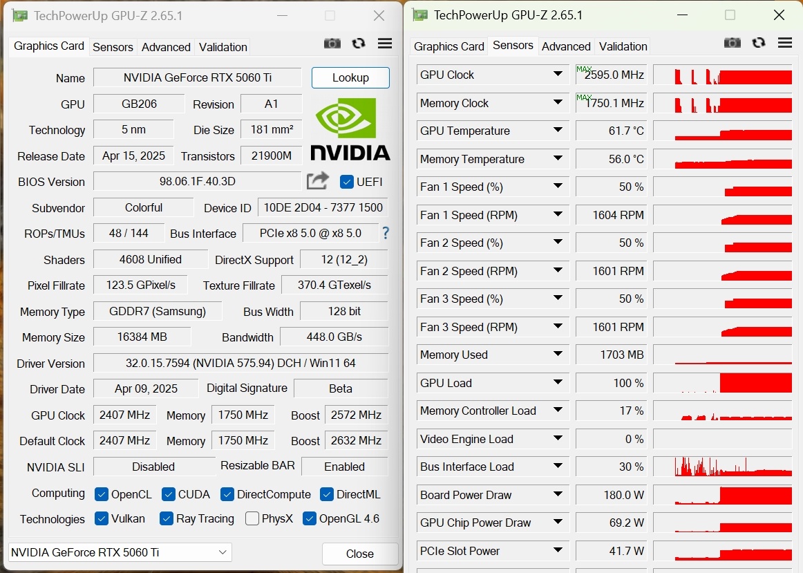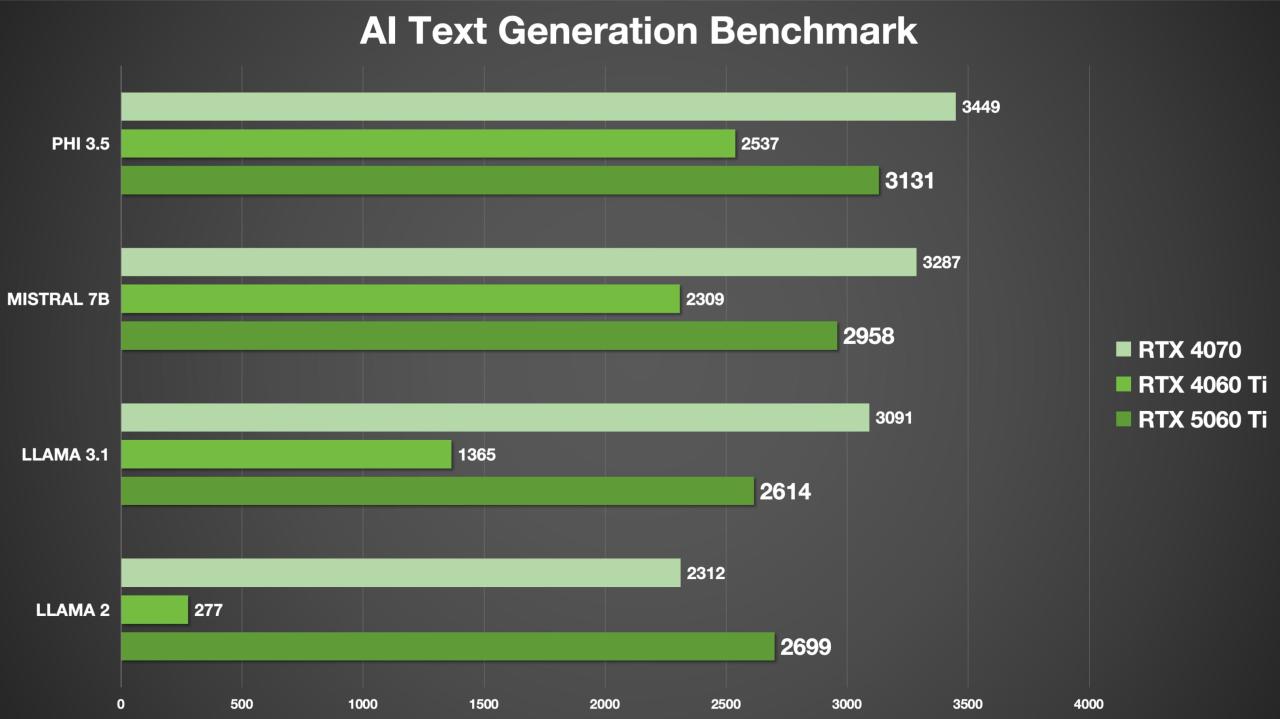 在UL的AI Text Generation Benchmark 測試中七彩虹iGame RTX 5060 Ti Ultra W OC 16GB顯卡在UL的大語言模型測試中PHI 3.5、MISTRAL 7B、LLAMA 3.1、LLAMA 2這4個大語言模型下的得分分別爲3131、2958、2614、2699。對於上一代RTX 4060Ti 8GB顯卡可以看到整體提升非常明顯,例如在LLAMA 2模型中提升近90%,甚至超過了上一代RTX 4070的表現,而且他幾組語言模型測試中都要大幅領先RTX 4060 Ti 8GB顯卡的。