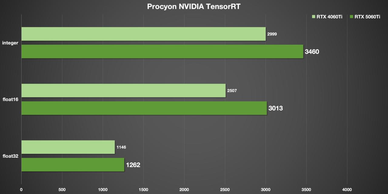 Procyon的NVIDIA TensorRT AI性能測試方面同樣對比RTX 4060 Ti 8GB顯卡的表現可以看到,在不同精度模型測試下全新的RTX 5060 Ti 16GB顯卡至少都有10%的性能提升,而在float 16精度模型下提升更是接近16%。