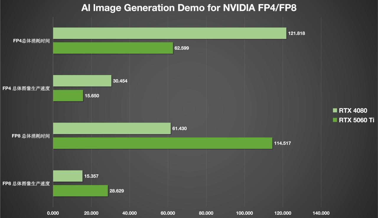 因爲RTX 4060 Ti 8GB顯卡無法測試FP4/FP8精度模型測試,所以這裏拿出之前測試的RTX 4080顯卡作爲參照對比,數值越小表示成績越好。可以看到在FP4精度模型測試中同樣16GB的RTX 5060 Ti 的Ai FP4文生圖表現甚至要好於同是16GB顯存的RTX 4080表現,對於計劃嘗試Ai的玩家來講,相信擁有16GB 顯存的RTX 5060 Ti顯卡會是一個很好的選擇。