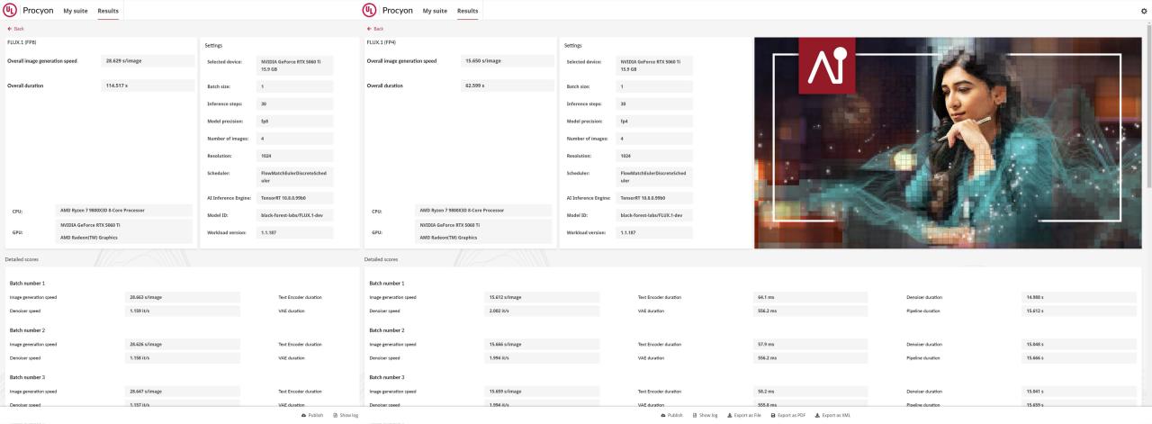 AI方面RTX 50系顯卡加入對於 FP4 精度模型處理,FP4 提供了一種較低的量化方法,類似於文件壓縮,該方法能夠顯著減小模型大小,讓AI運算對顯存的要求更低,效率自然也大幅提升。所以這裏也測試了Procyon的AI Image Generation Demo for NVIDIA測試,模型爲Flux1DEV_ONNX。具體測試成績如圖,之前也做了其他RTX 50系顯卡的測試,大家可以對比了解一下看看。