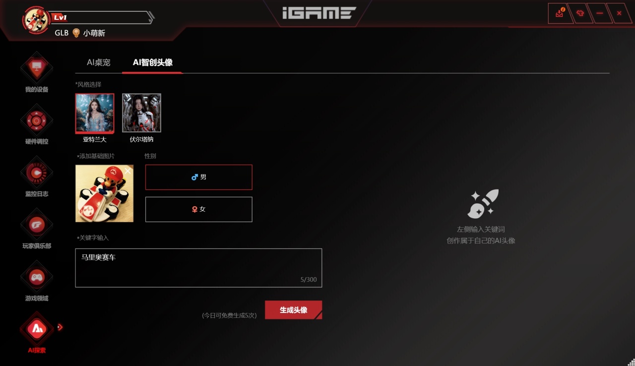 另外還注意到這次在iGame“自在星球”軟件還加入AI桌寵和AI智創頭像的功能。也是加入了對於AI的實現和落地。玩家可以通過上傳照片實現AI智能生成頭像的功能。而且還支持設置關鍵提示詞,根據提示詞和上傳的圖片來生成新的AI頭像。