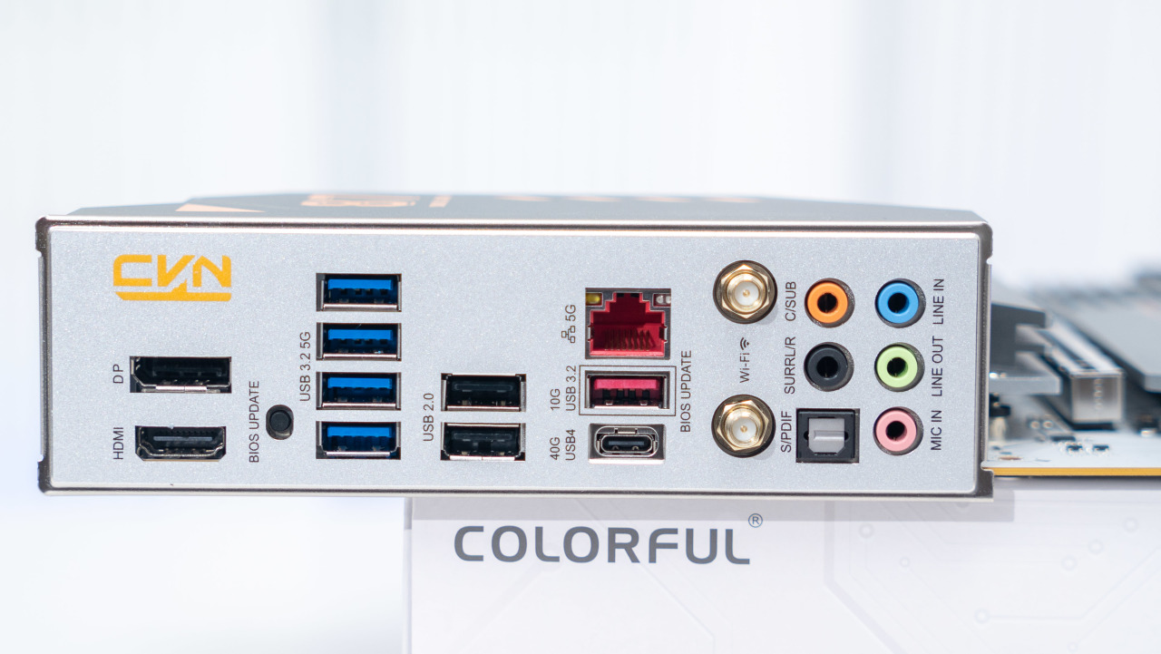IO接口一覽,40Gbps的Type-C接口、5G的RJ45網口以及WiFi7 無線網卡都有安排。此外還提供了四個5G的USB 3.2接口,兩個USB 2.0以及一個紅色的10Gbps USB 3.2接口方便玩家擴展。