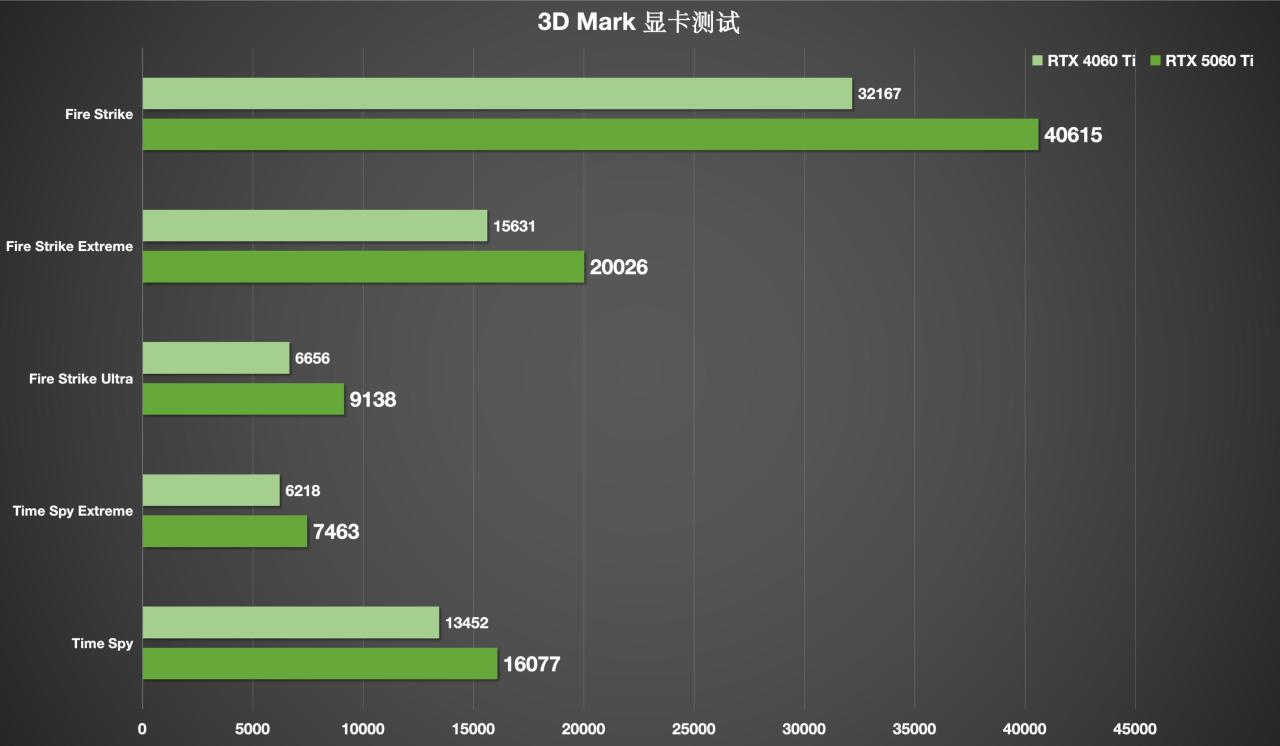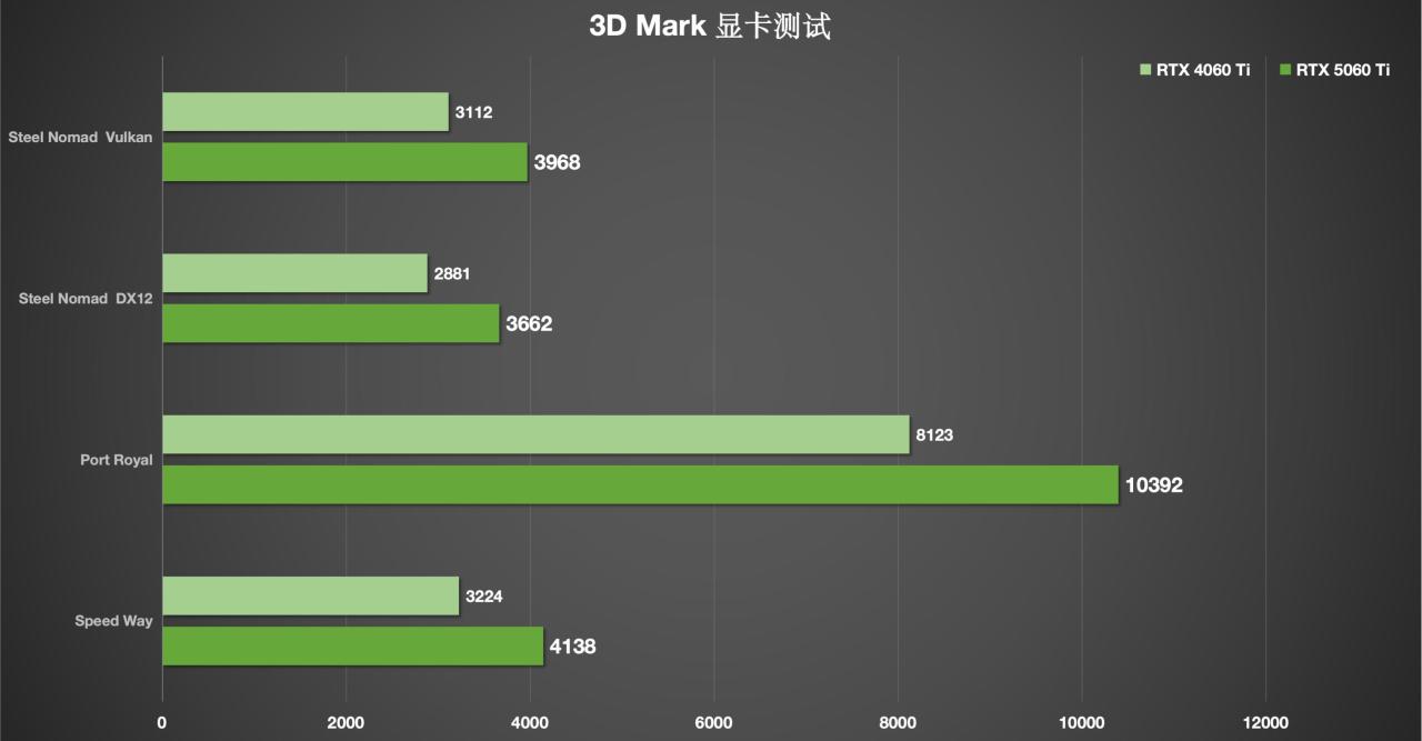 而在3D Mark光追等表現上RTX 5060 Ti依舊足夠亮眼,整體提升都達到了22%左右,不少分數甚至直追RTX 4070的分數表現。