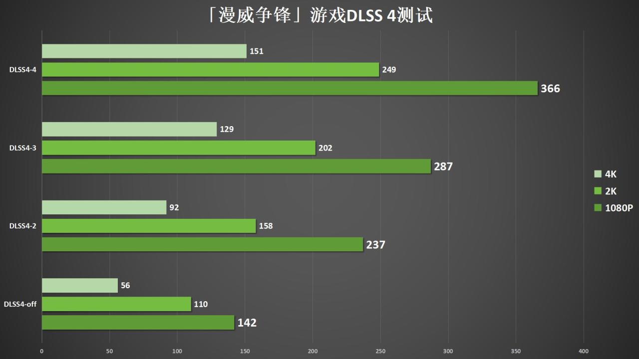在FPS射擊遊戲的「漫威爭鋒」中測試開啓DLSS 4 4x前後遊戲幀數對比,對比未開啓DLSS 下的遊戲幀數表現,可以看到在不同分辨率下,開啓DLSS 4前後遊戲幀數都至少有3倍的幀數暴增。對於RTX 5060 Ti這樣的顯卡表現,我覺得這樣的遊戲幀數是足夠滿足大部分玩家的需求的。