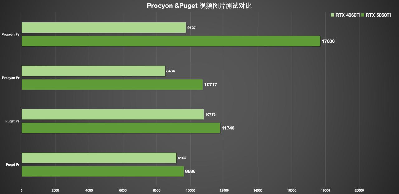 生產力方面選擇測試了大部分用戶更關注的Adobe的Ps和Pr圖片和剪輯軟件測試,對比可以看到在同配置下RTX 5060 Ti顯卡相比上一代RTX 4060 Ti顯卡都具有一定的性能領先。