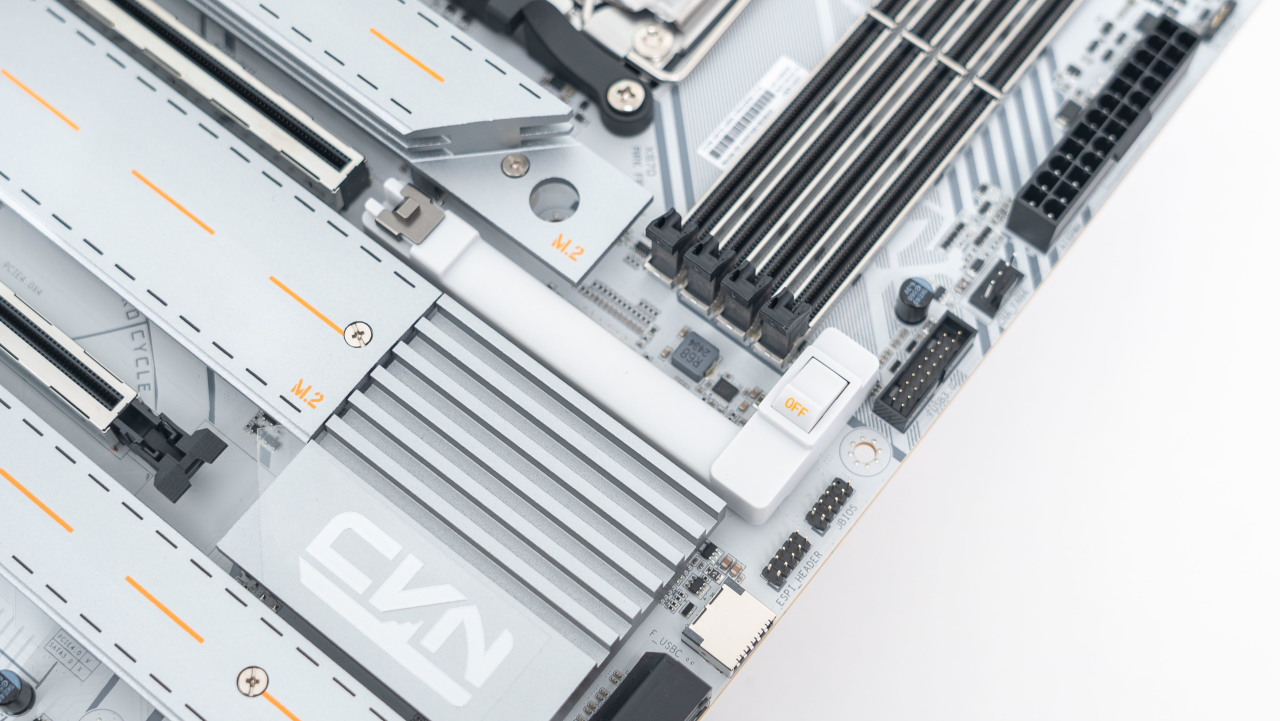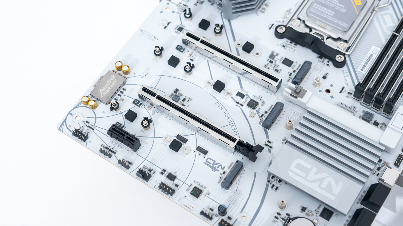 兩條全長的PCIe x16插槽以及三個M.2 SSD硬盤的擴展配置設計,三個M.2 SSD接口均配置了散熱鎧甲來幫助散熱。第一條PCIe x16插槽爲CPU直連的PCIe 5.0 x16設計,滿足最新的50系顯卡需求。這個接口還做了金屬加固,而且採用了七彩虹CVN第一代顯卡易拆設計,尾部鎖釦安全穩定,可以方便玩家一鍵開啓顯卡卡扣鎖定模式。