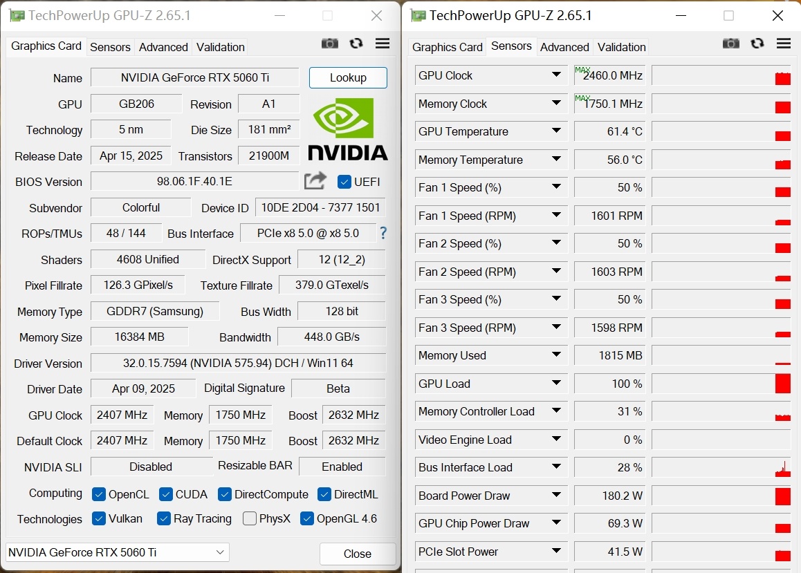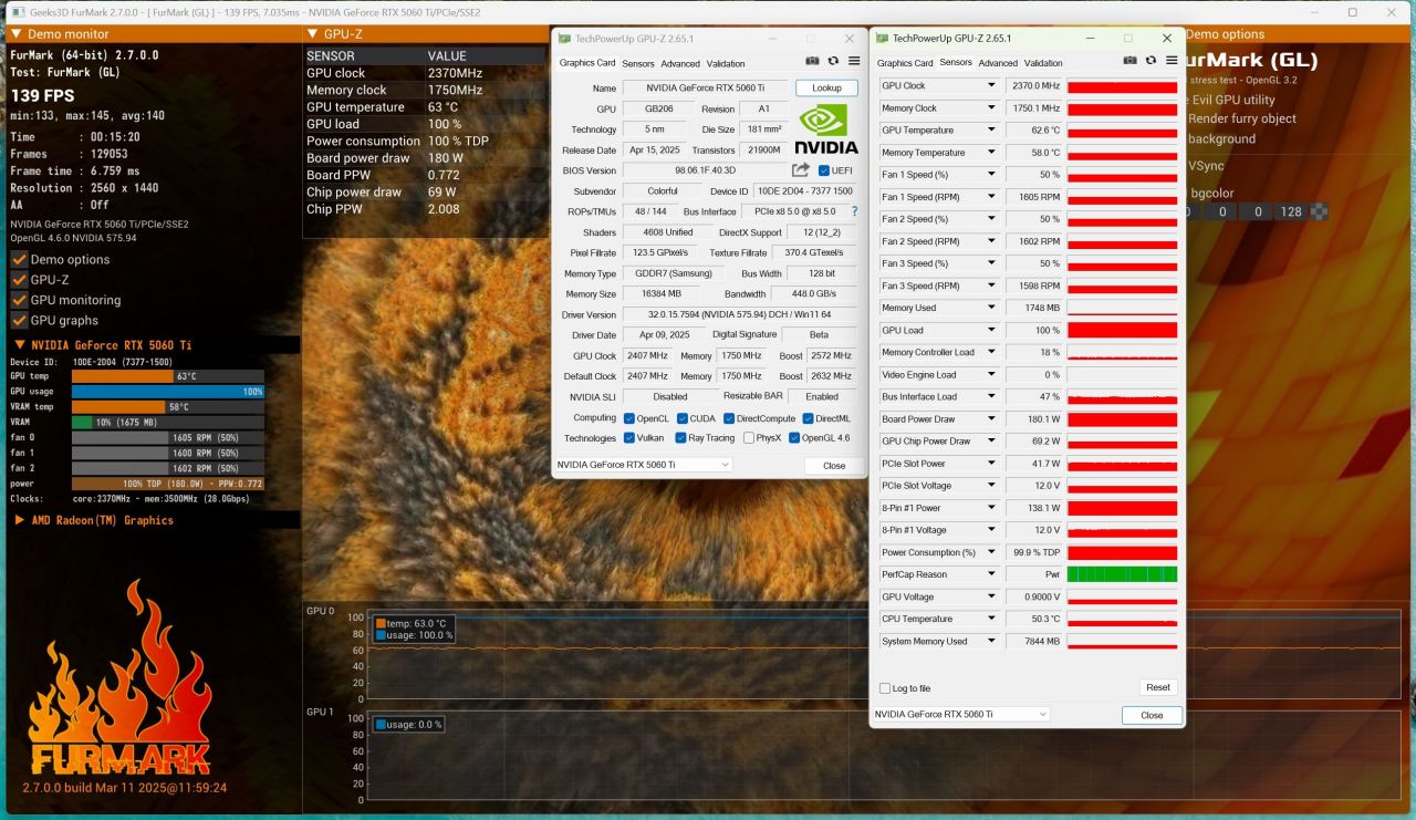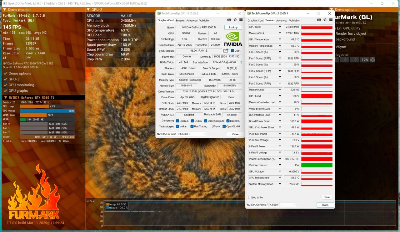 一鍵超頻頻率下iGame RTX 5060 Ti Ultra W OC 16GB顯卡約63℃,顯存約58℃。風扇轉速約1600RPM,平均頻率2400MHz。