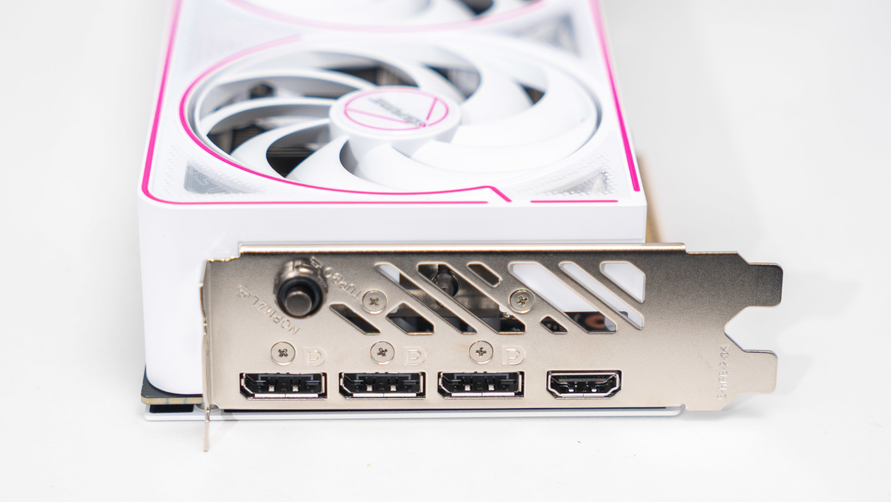 接口方面提供了三個DP 2.1b以及一個HDMI 2.1b接口,七彩虹iGame顯卡標誌性的一鍵超頻按鈕也設計在PCIe 板位置,方便玩家在標頻與OC模式間切換。