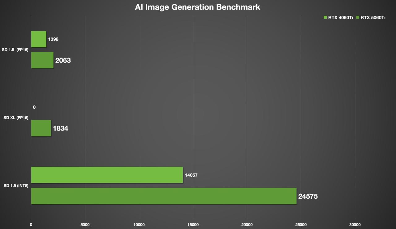 Procyon的AI Image Generation Benchmark測試中,可以同樣看到七彩虹iGame RTX 5060 Ti Ultra W OC 16GB顯卡在這個測試中依舊錶現出色,對於對比RTX 4060 Ti 8GB顯卡,可以看到在SD FP16模型精度下領先32.23%左右,在INT8模型精度下領先約42.8%。而RTX 4060 Ti 8GB的顯存容量無法支持SD XL FP16的顯存需求,故測試結果爲0 。