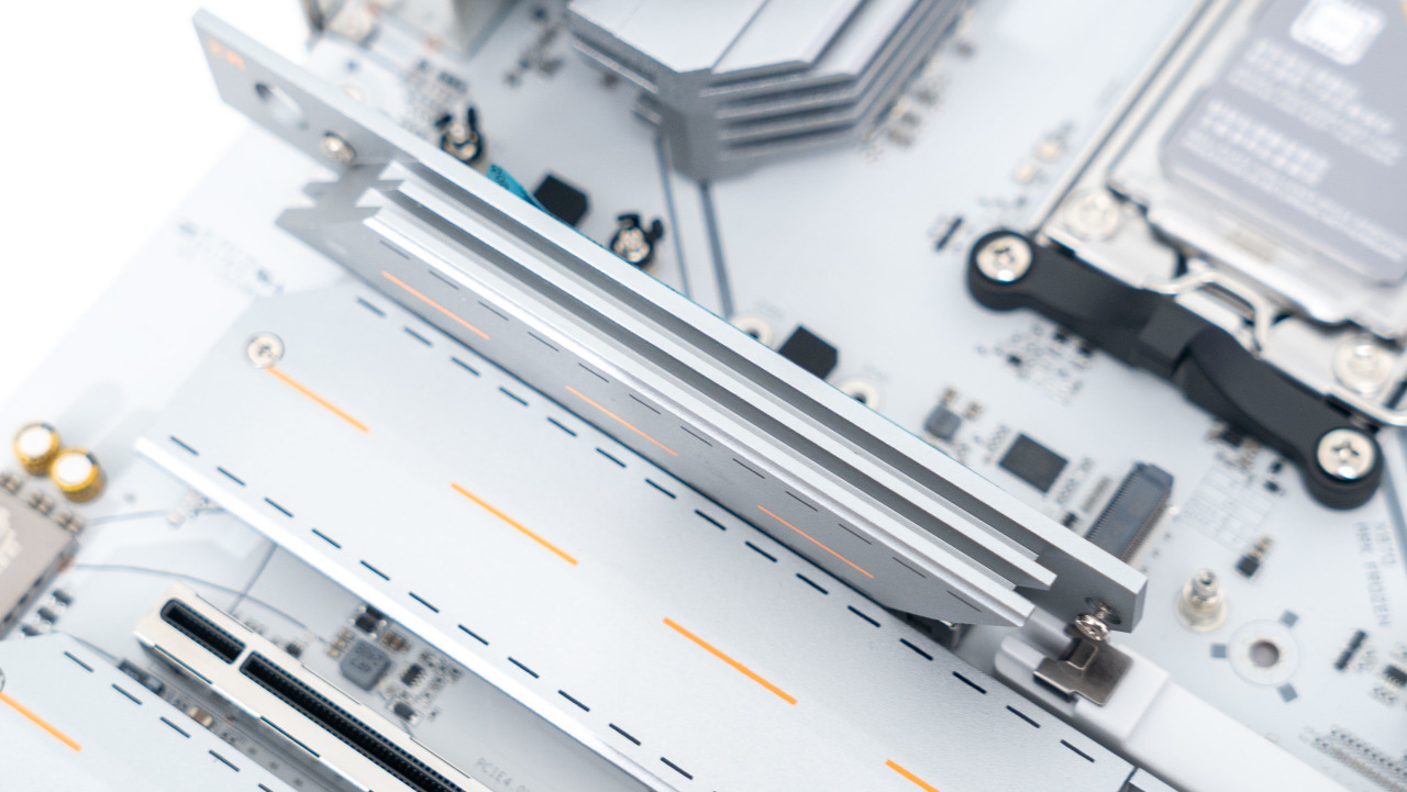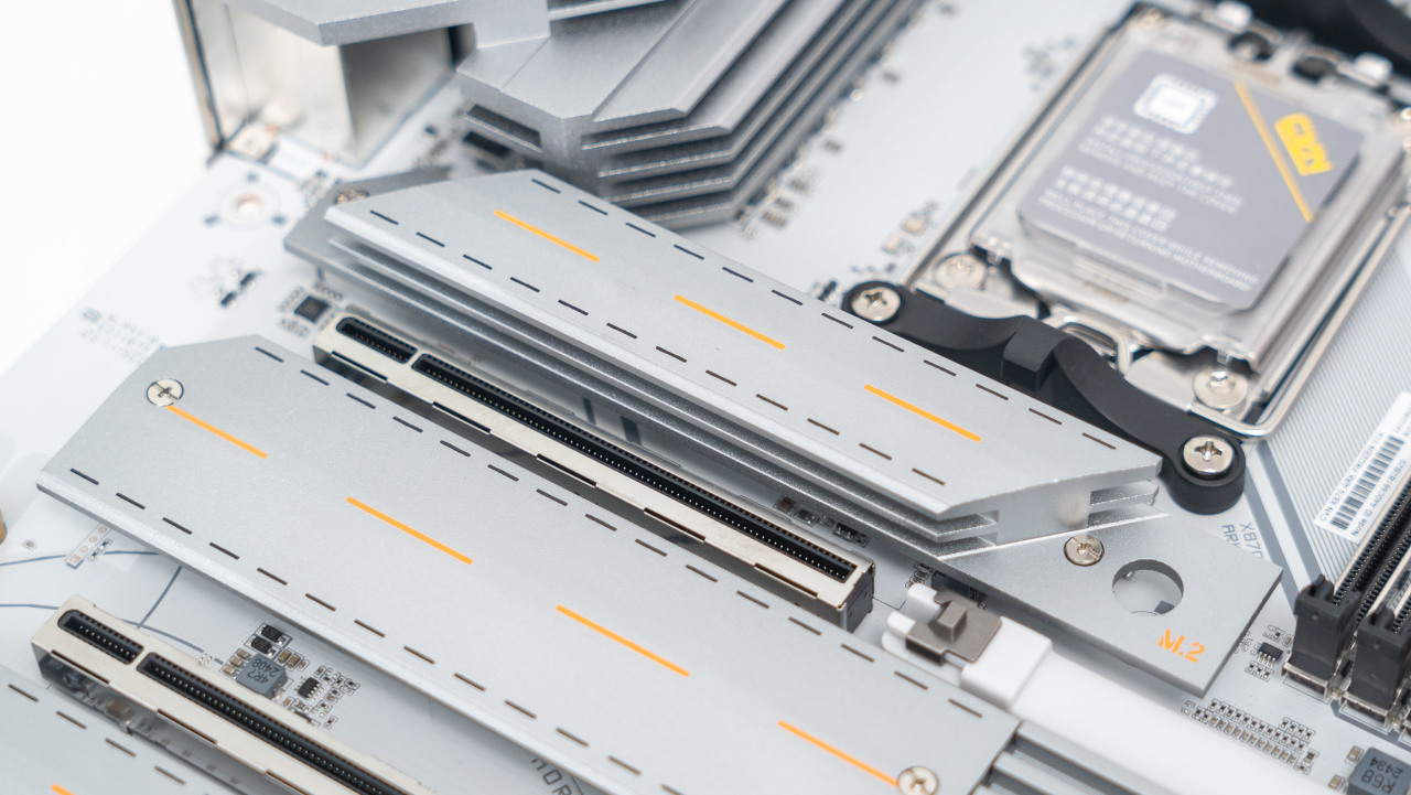 主板正面的M.2 接口爲CPU直連的PCIe 5.0速率,而且配置獨立的散熱模塊並且做了加厚處理,而且堆疊式設計的寒霜散熱裝甲通過增加散熱面積的風扇來提升被動散熱表現。
