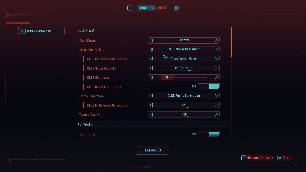 目前大家非常熟悉的賽博朋克「2077」更新到最新的2.21版本之後就可以在設置中看到DLSS 4的模式選項了,測試選擇Performance檔位。