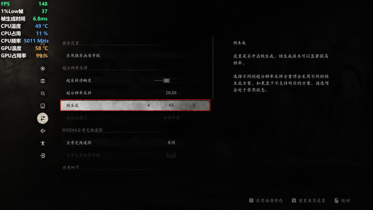 這次測試最後階段,Epic版本的黑神話悟空更新後已經加入了對於DLSS 4的支持,這裏我也第一時間更新了跟大家分享一下測試結果,可以看到設置界面中已經更新可以手動開啓DLSS 4了。