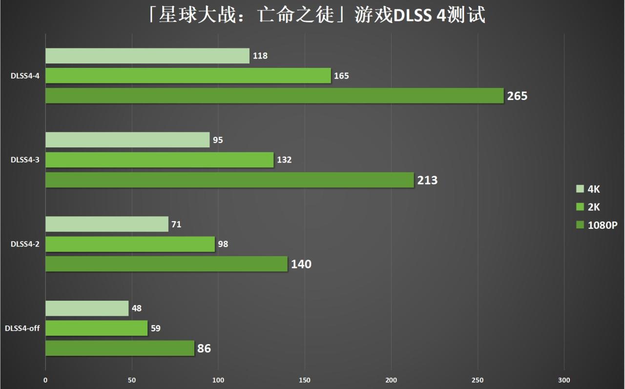 「星球大戰:亡命之徒」也是第一波加入了DLSS 4的遊戲,目前已經可以直接在設置頁面設置開啓DLSS 4了,依舊測試了DLSS 4性能模式開啓前後,在不同幀生成模式下顯卡的表現。其中4K分辨率下未開啓DLSS的遊戲幀率爲48 FPS,DLSS 4幀生成4x開啓後,遊戲幀率達到了118,流暢度提升了2倍以上。而2K和1080P分辨率下游戲幀數提升更是達到了3倍以上。