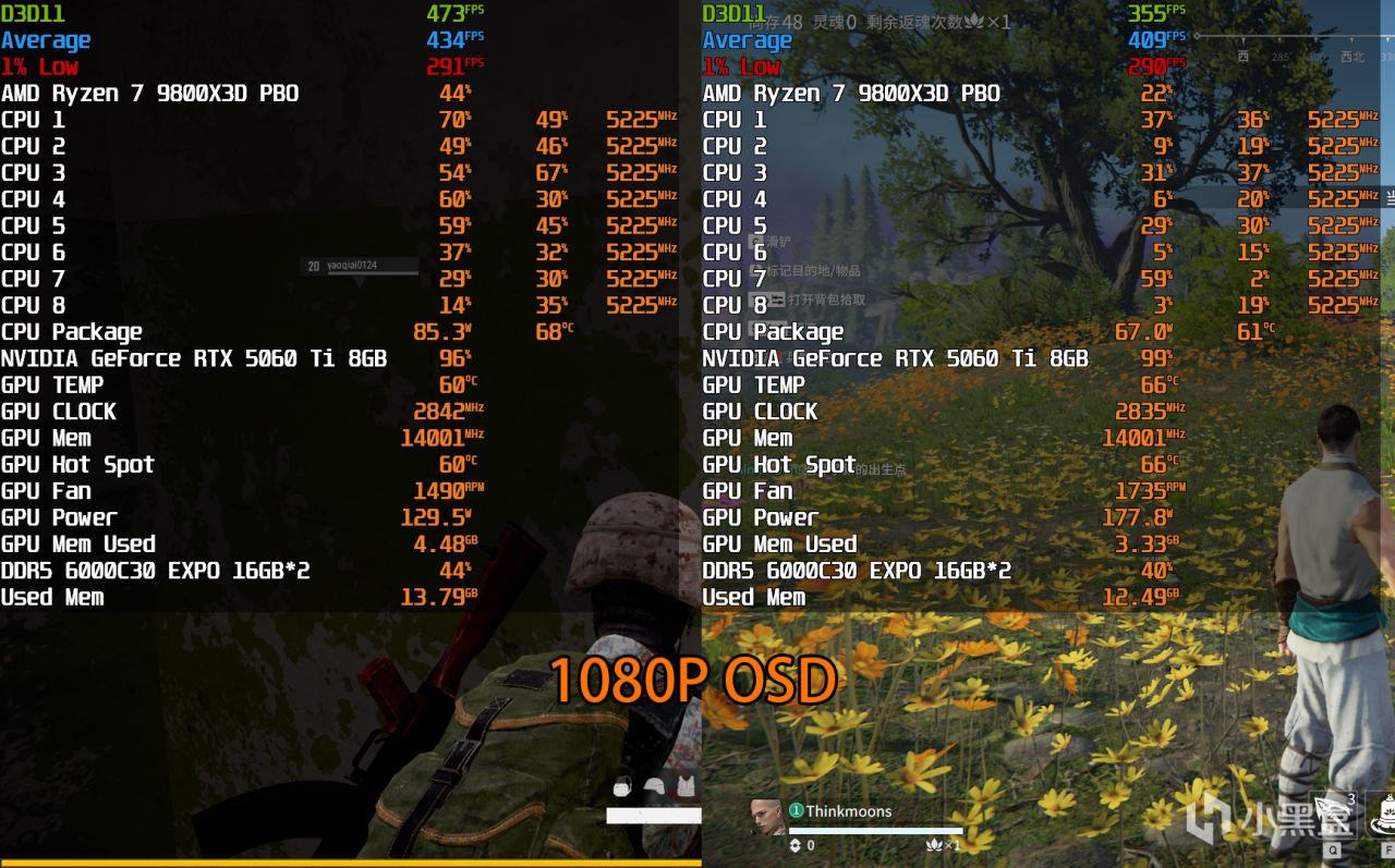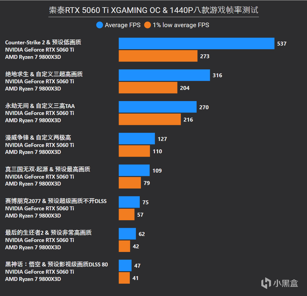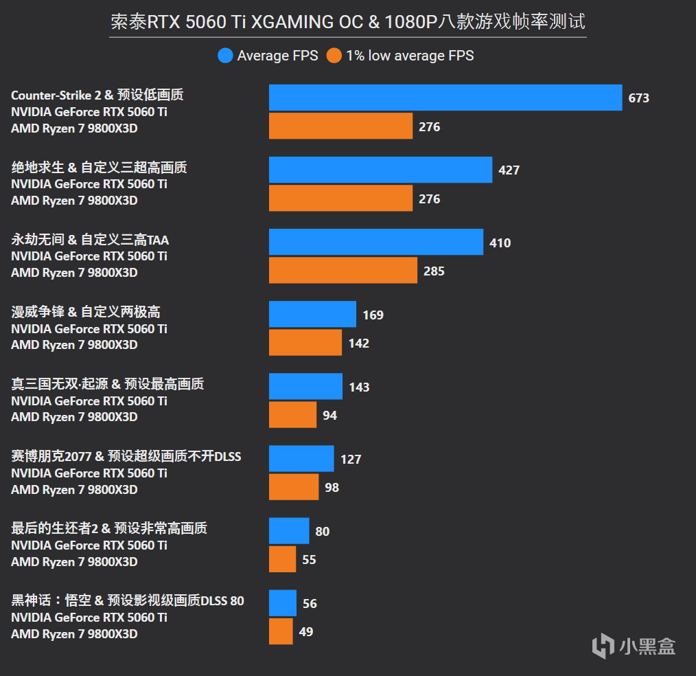 這裏稍微解釋一下,電競遊戲都是降低或者自定義畫質進行測試的,符合電競追求極致幀率的真實需求,降畫質並不需要擔心CPU成爲瓶頸,能看到以上在1080P分辨率中,用目前最強遊戲處理器9800X3D搭配,RTX 5060 Ti 8GB的使用率仍無限接近100%,這就意味着顯卡也在全力跑沒浪費其性能。
