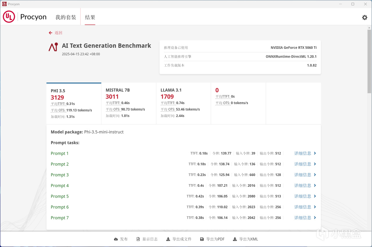UL Procyon的AI Text Generation Benchmark測試中,RTX 5060 Ti 8GB在PHI 3.5、MISTRAL 7B、LLAMA 3.1三種大語言模型中分別得分3129,3011,1709,均能輸出較高的Tokens/s性能,唯一就是LLAMA 2對於RTX 5060 Ti 8GB來說屬於溢出項目,因爲8GB顯存完全不夠,得讓16GB版本來跑。