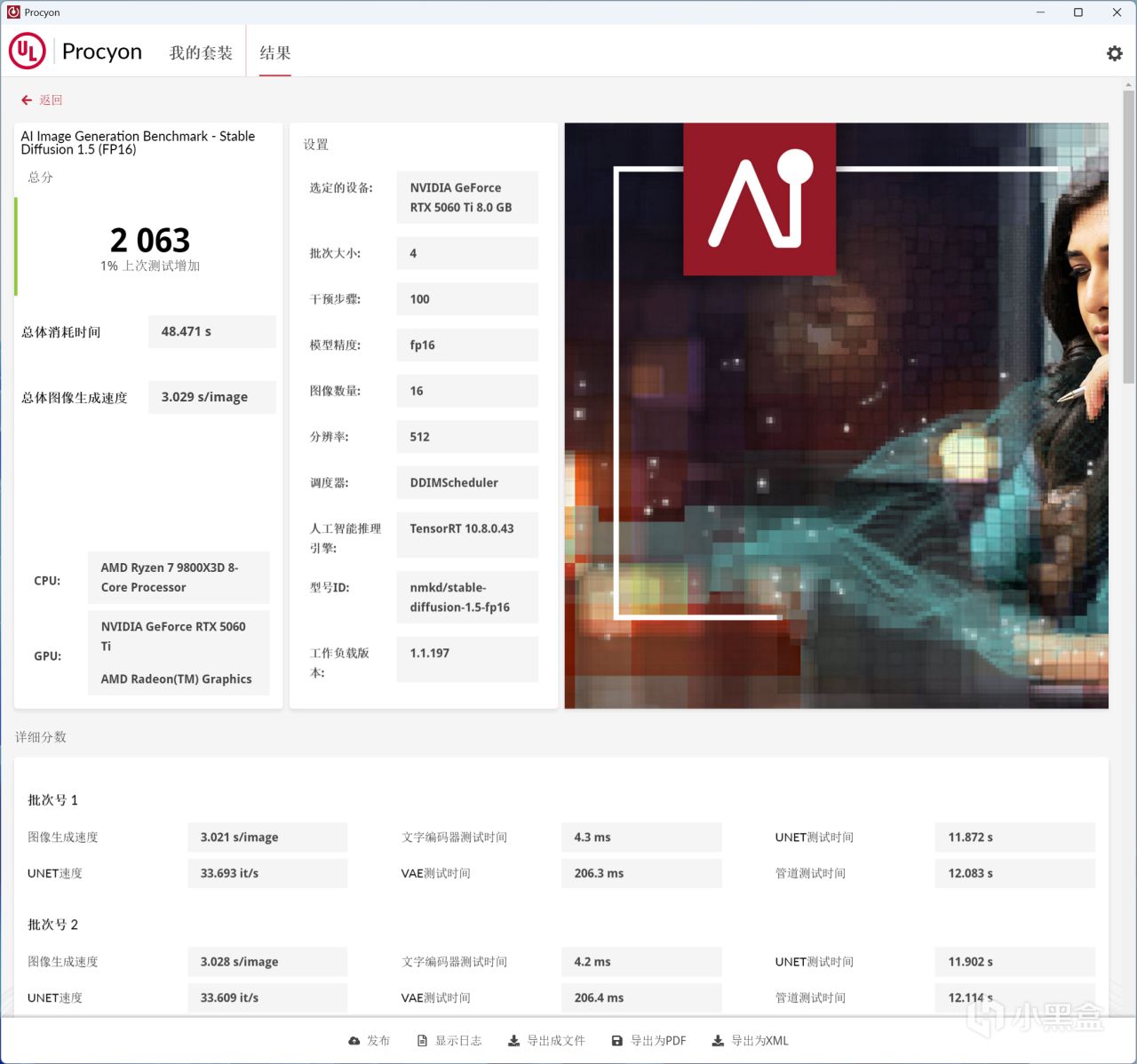 UL Procyon的AI Image Generation Benchmark,針對的是FP16模型精度的SD 1.5測試項目,RTX 5060 Ti 8GB得分2063,具體來看,生成512分辨率、4批次和16張圖像,生成速度可保持3s /image,屬於完全可用的程度。