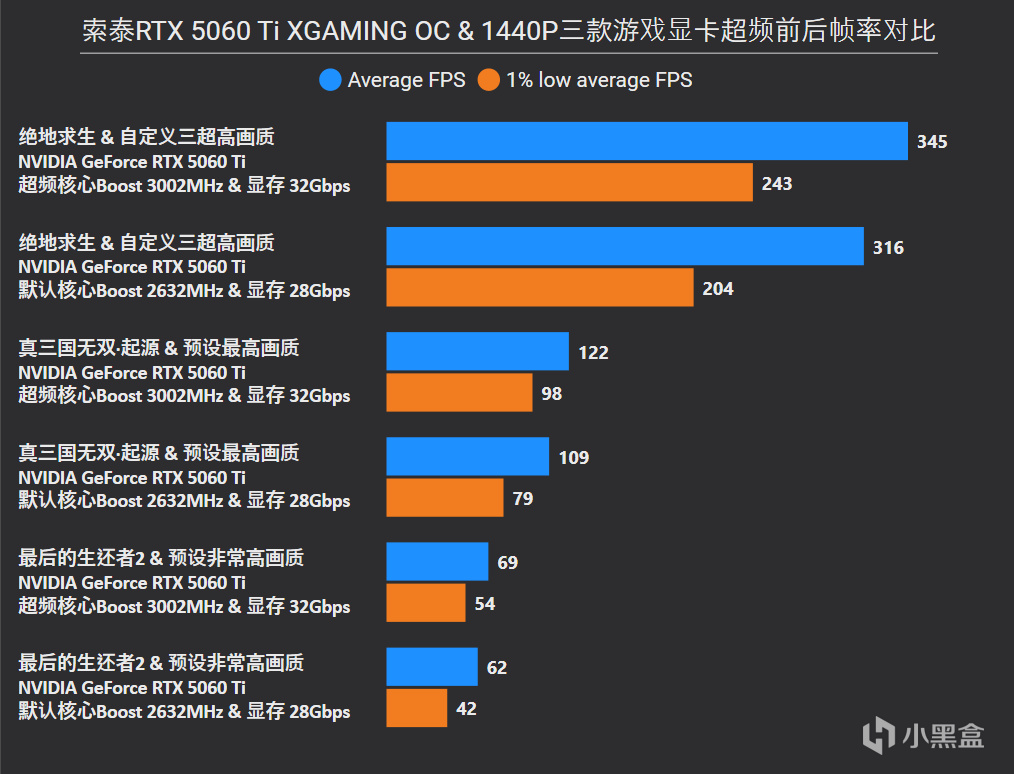 超頻後在遊戲中保持着理論類似的提升幅度,就2K分辨率而言,《絕地求生》、《真三國無雙·起源》和《最後的生還者2》平均幀率超頻提升幅度分別爲11%、12%和9%,而1% LOW幀提升還要更大,尤其是《最後的生還者2》已經達到20%幅度,32Gbps的GDDR 7一定程度上彌補了來自顯存的短板,也驗證這款遊戲對顯存是有門檻的。