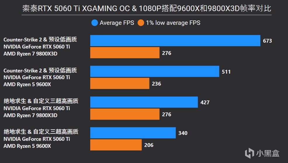 1080P發燒級電競玩家,一般對幀率極其敏感,暫時預算有限後期打算升級,個人就更推薦一步到位使用9800X3D搭配RTX 5060 Ti 8GB,能看到如果把CPU換成千元主流的9600X,《Counter-Strike 2》和《絕地求生》平均幀率竟然分別相差25%和31%,這已經是快兩個級別顯卡的跨度了吧。