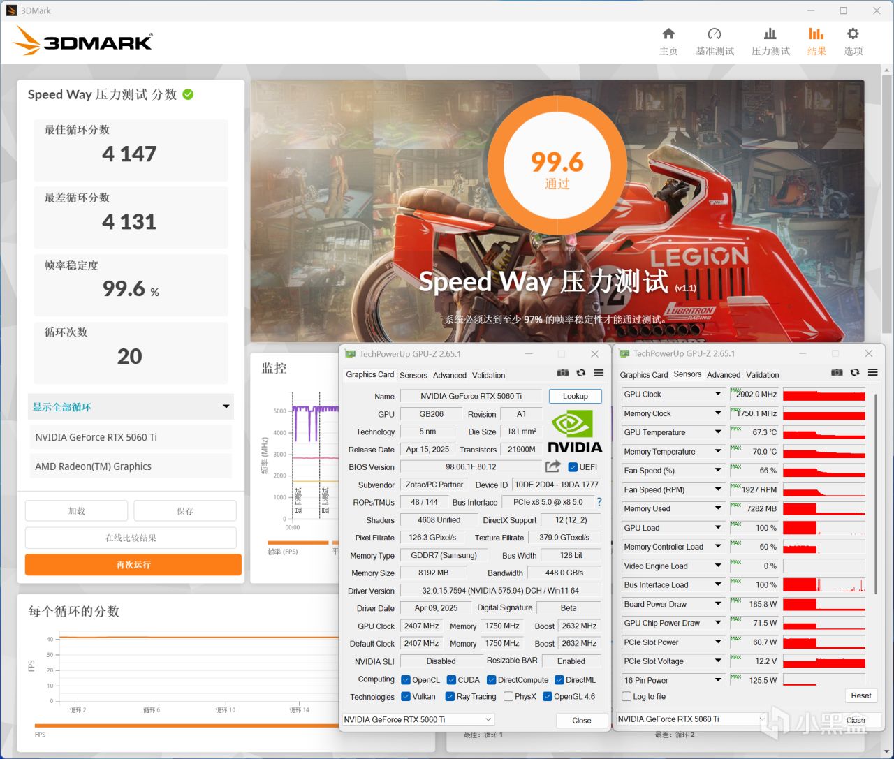 最後使用3DMARK Speed Way壓力測試驗證一下索泰RTX 5060 Ti XGAMING OC 8GB的散熱性能,這是一個涉及光追和光柵的高負載項目,最終通過穩定度達到了99.6%之高,GPU核心最高溫度爲67℃,顯存最高溫度70℃,風扇最高轉速1927 RPM,溫度表現還算不錯,滿載時噪聲感知也比較小的。