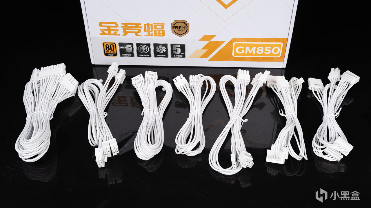 作爲高性價比電源,全套PVC壓紋模組線也自然也少不了,編織的質感可以讓裝機更方便和美觀,金競蝠GM850模組線提供了1*24pin供電、1*8(4+4)pin CPU供電、2*6+2pin PCIe供電、1* 12V-2X6 16pin PCIe供電(450W)、3*SATA+1*PATA這些類型。