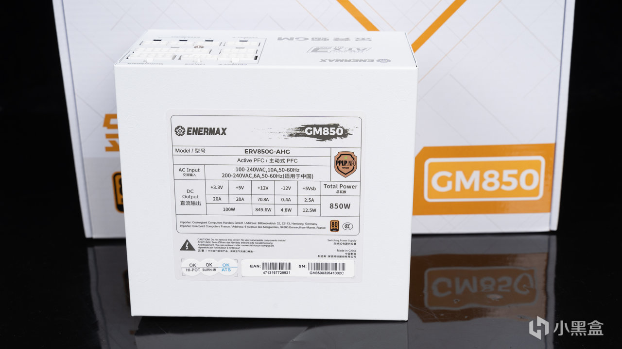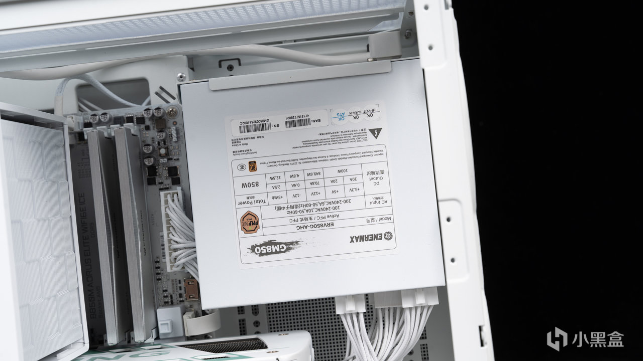 電源方面使用的是安耐美金競蝠GM850白色,其定位是高性價比ATX 3.1電源,機身尺寸僅爲150X86X140mm屬於緊湊類型,它搭載一枚120mm FDB液壓軸承風扇,看可以兼顧低噪和良好的散熱性能。