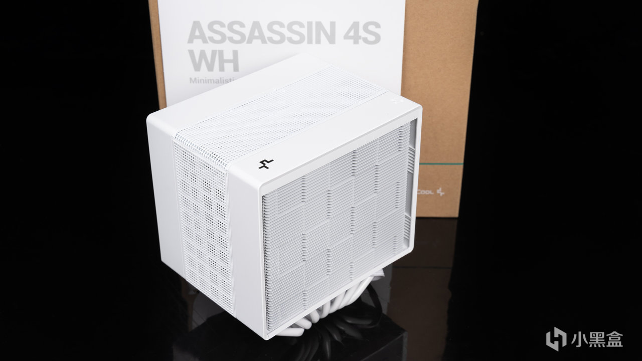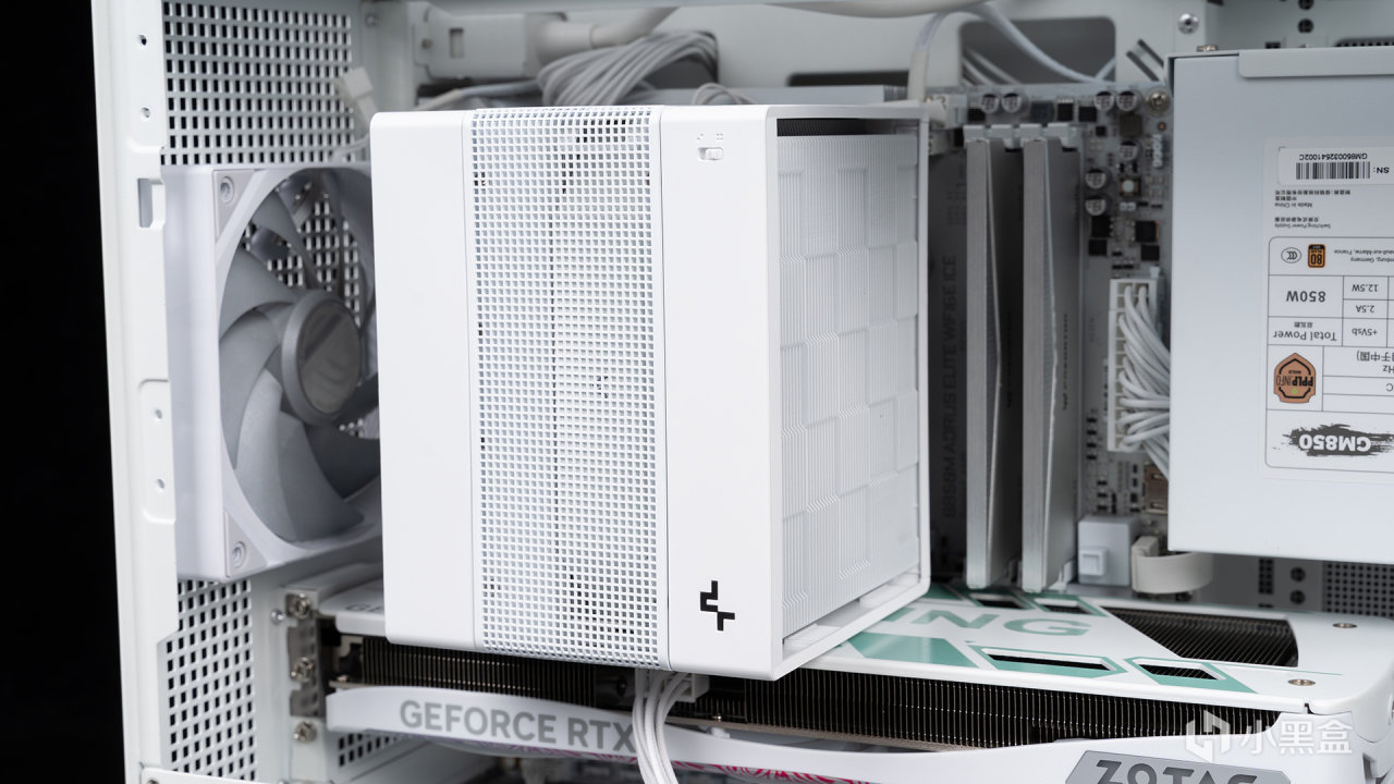因爲9800X3D功耗不高,所以CPU散熱器使用了九州風神阿薩辛4S,它無論從哪個角度來看,都是屬於隱藏風扇的極簡耐看的風格,辨識度相當高,頂部有一個雙模開關,可在全速和安靜兩種模式之間切換,另外頂部LOGO也是發光的(隨模式不同亮度也不同)。