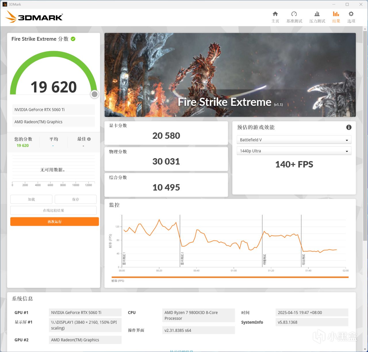3DMARK Fire Strike Extreme,索泰RTX 5060 Ti XGAMING OC 8GB顯卡分數爲20580