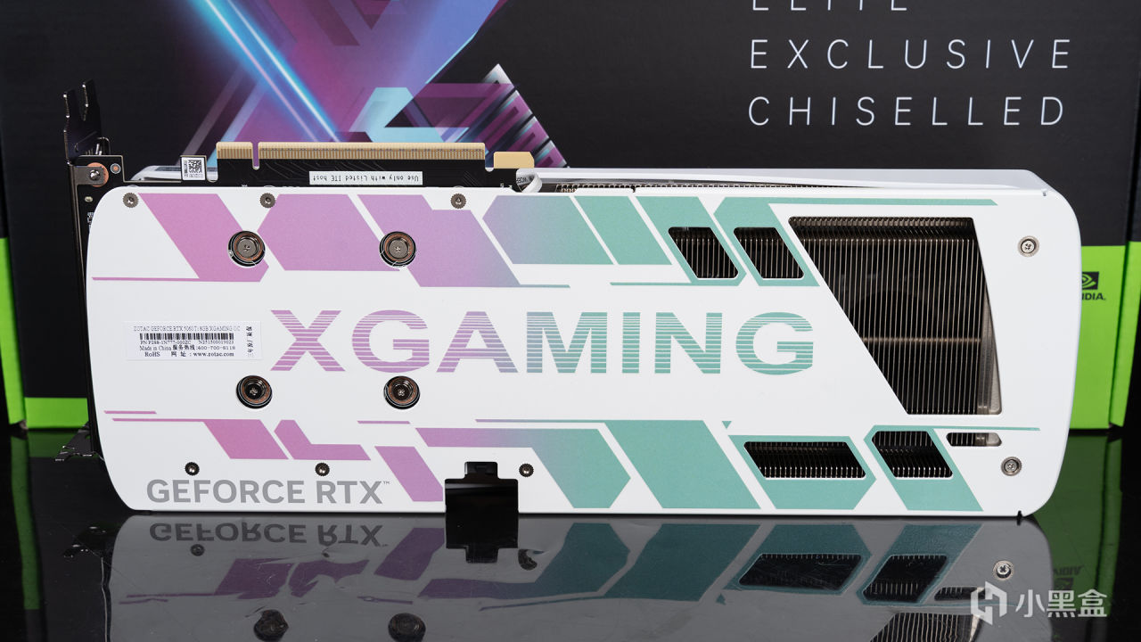 RTX 5060 Ti XGAMING OC 8GB配備高強度的合金背板,能有效保護顯卡PCB和增加結構強度,背板上亦有粉色、青色兩種色彩混合的XGAMING和圖案保持整卡一致的視覺效果。尾部是主流的貫穿式風道,使風流可以垂直穿透鰭片提升散熱效能。