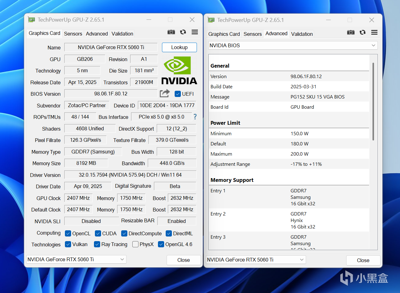 GPU-Z最新版本已經能識別到RTX 5060 Ti,索泰RTX 5060 Ti XGAMING OC 8GB是屬於超公版設計,標註Boost頻率達到2632MHz,比公版設定2572MHz還要略高一些,同時GPU默認功耗爲180W,其功耗可解鎖上限至200W,略低於RTX 4070公版設定。