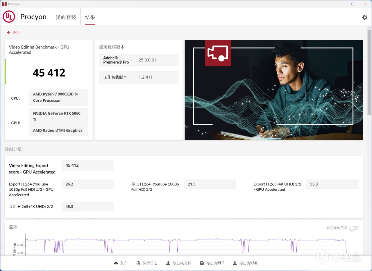 UL Procyon視頻編輯基準,運行項目是Adobe Premiere,有相當大的部分受顯卡影響——RTX 5060 Ti 8GB利用CUDA框架加速最終得分45412,具體展開來看,聯合CPU和GPU加速導出1080P視頻時間可從26.2 s縮短至21.5 s,而4K視頻可從55.3 s縮短至45.3s。