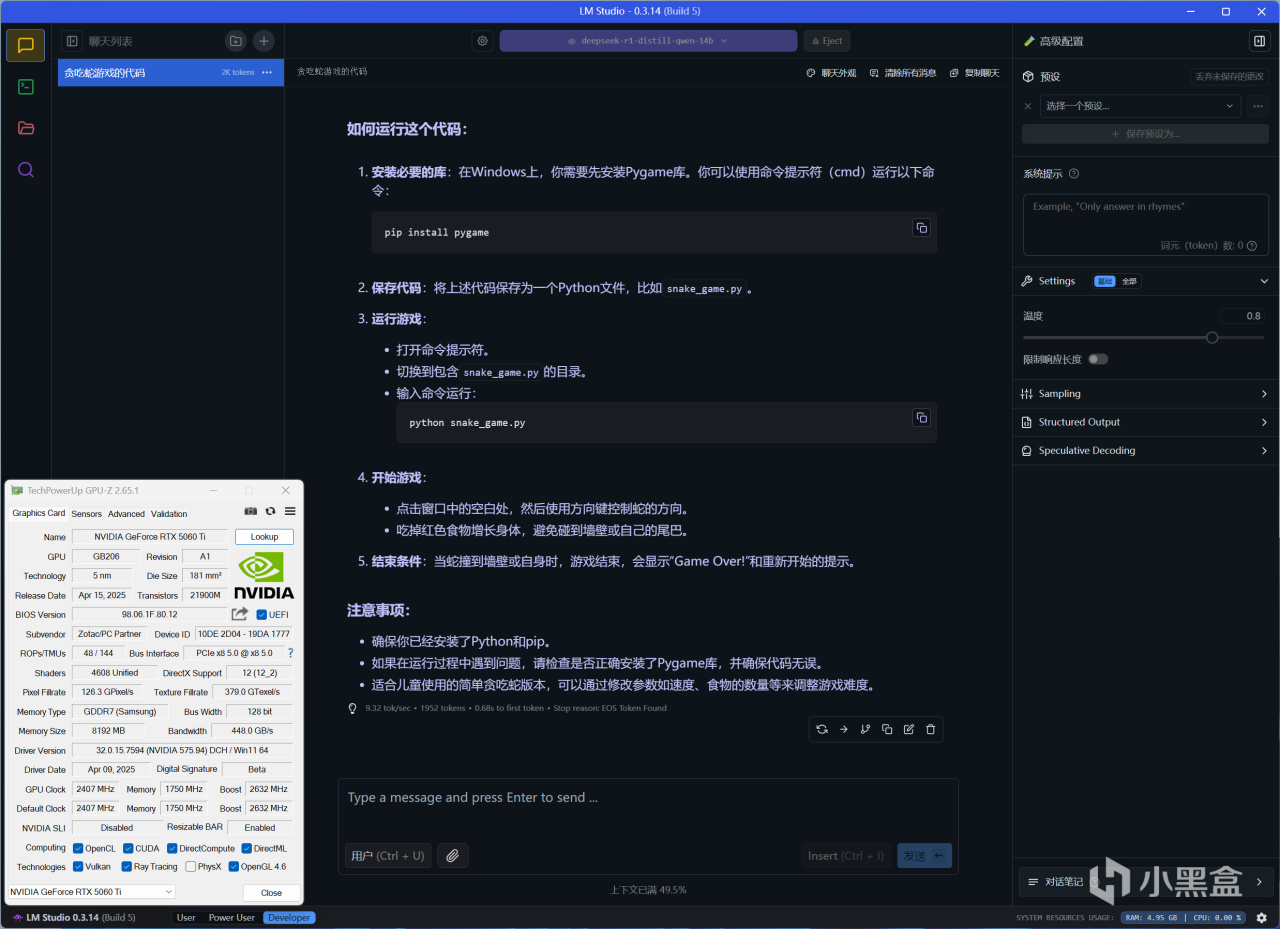 DeepSeek-R1-Distill-Qwen-14B-Q4量化精度,在GPU卸載27和開啓閃電注意力設置下,問的是一條常規寫代碼的問題,RTX 5060 Ti 8GB推理速度大致爲9.32 tok/sec,實際等待時間尚可接受,不過GPU卸載並不能拉滿,也就是需要CPU來協同,畢竟8GB顯存還是制約了一定性能。